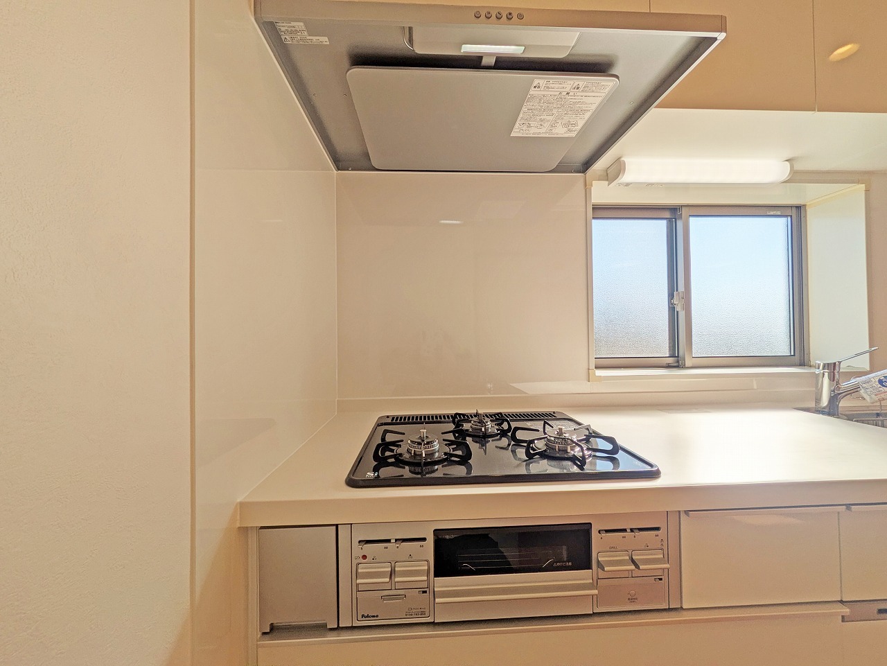 3口のガスコンロで、お料理はよりスピーディーに。 お手入れのしやすいフラットタイプのレンジフードです