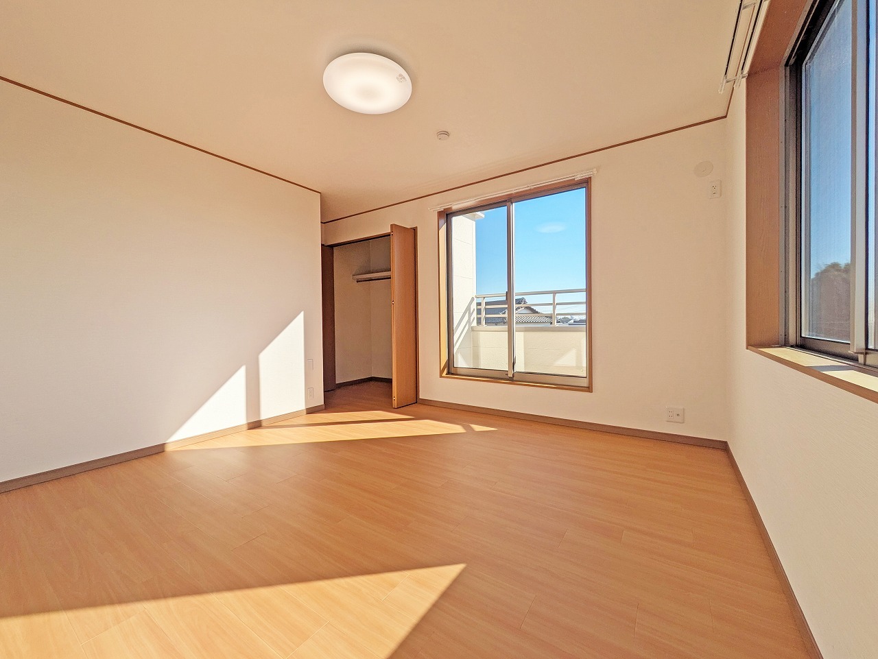 大きめのベッドを置いても、まだゆとりが持てる大きさ。8.5帖の主寝室。