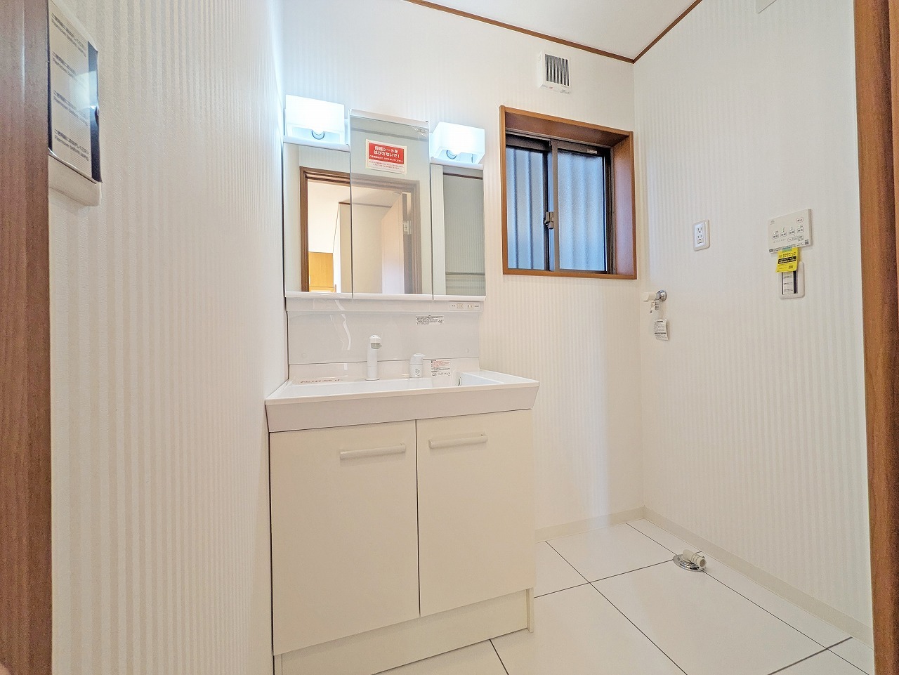 洗面台横にランドリーコーナーもゆったり。ドラム式洗濯機も置けそう。