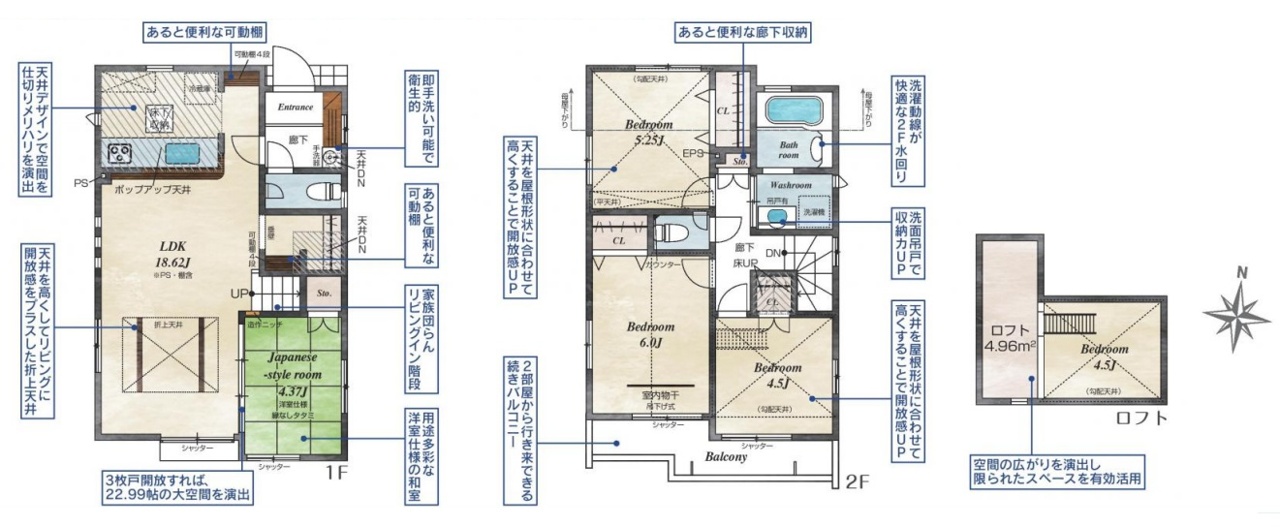 吹抜けの空間を意識した開放感のある間取り。そして上部にロフトを配置。スタイリッシュかつ収納も豊富で長く機能的に住める家を目指して。
