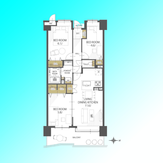 | 間取 | 3LDK (LDK11.6帖、洋室6.1帖、洋室5.8帖、洋室4.6帖) | ||