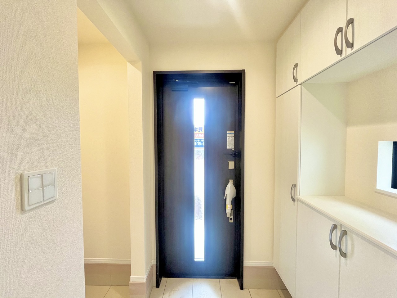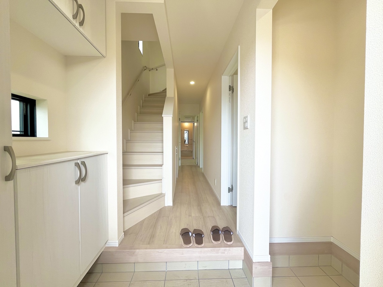 明るく開放的な玄関、靴の脱ぎ履きもしやすく、収納も豊富でご家族皆様の靴をスッキリ収納できます。