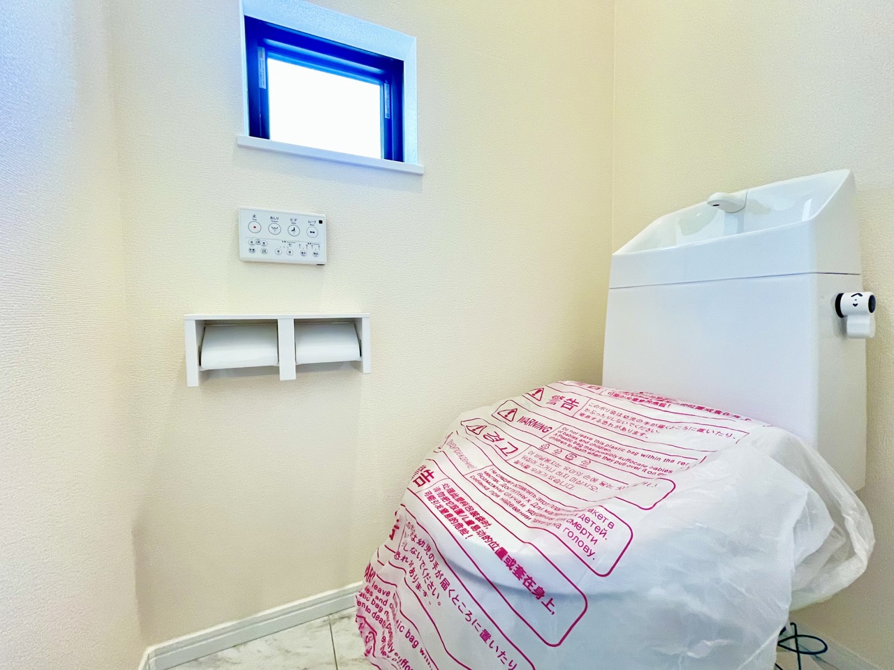 ウォシュレット機能付きのトイレ。換気のしやすい窓付きで、収納もあり実用性も兼ね備えた造り。