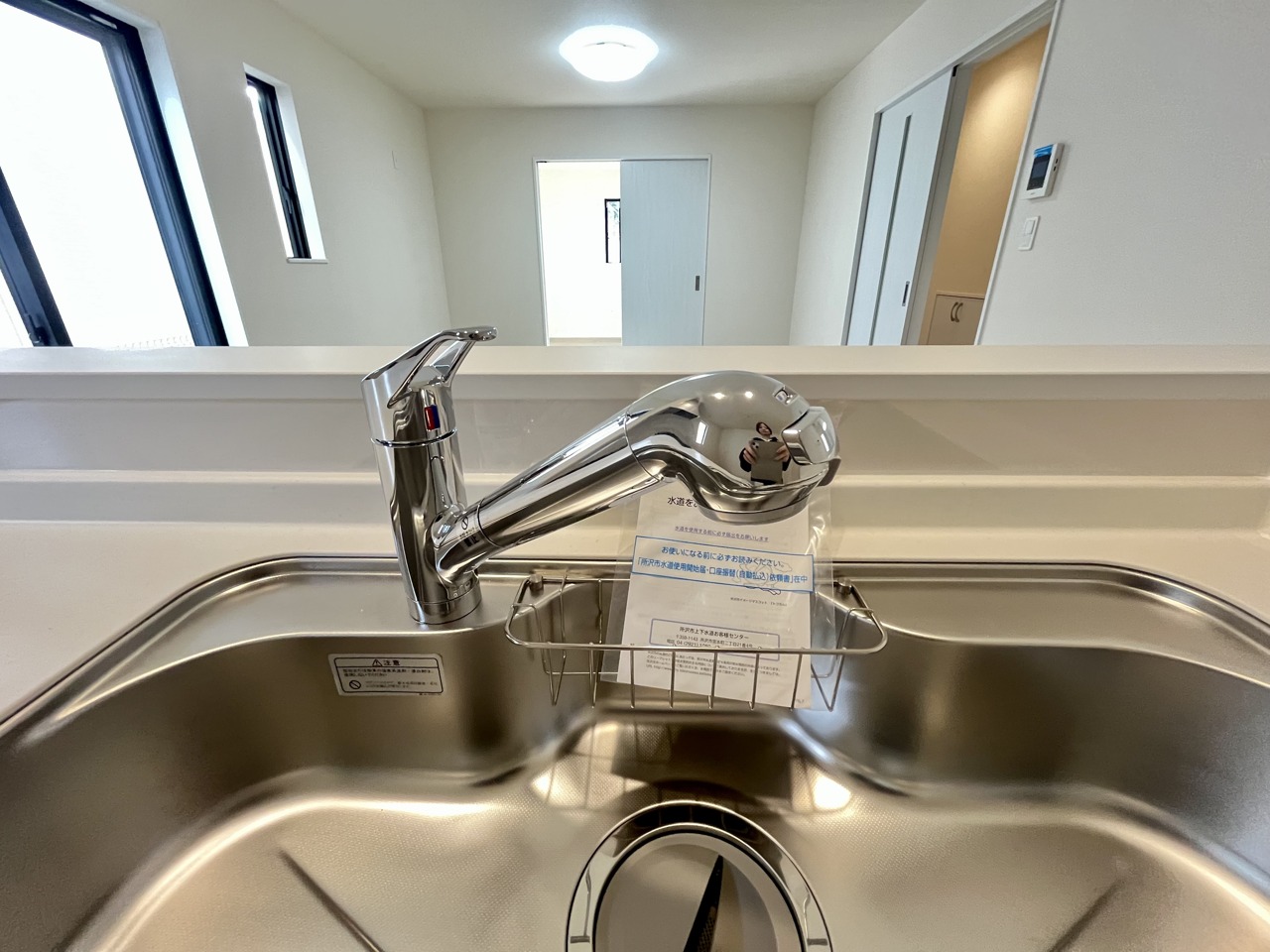 リビングにいる家族の顔が見渡せるカウンターキッチン。お料理もより一層おいしく、楽しく。食器棚を背面に設置しても十分な広さを確保しています。