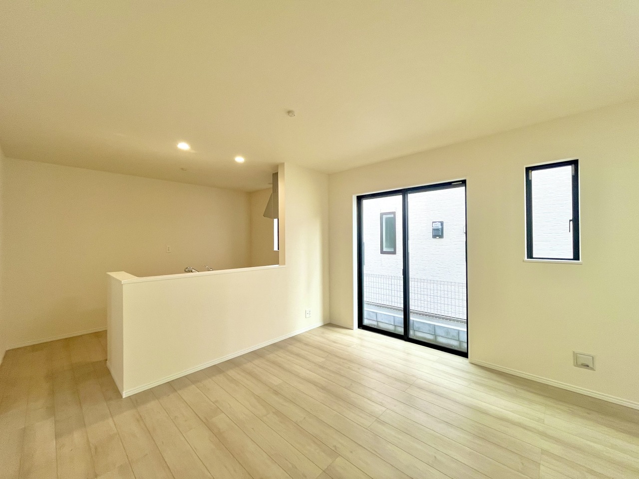 大きな開口部から明るい光が差し込む、日中の室内の明るさがこの部屋の魅力です。