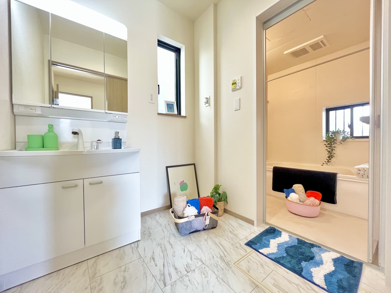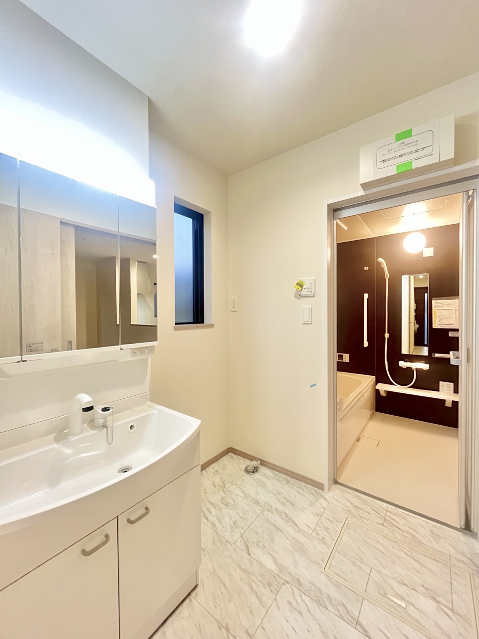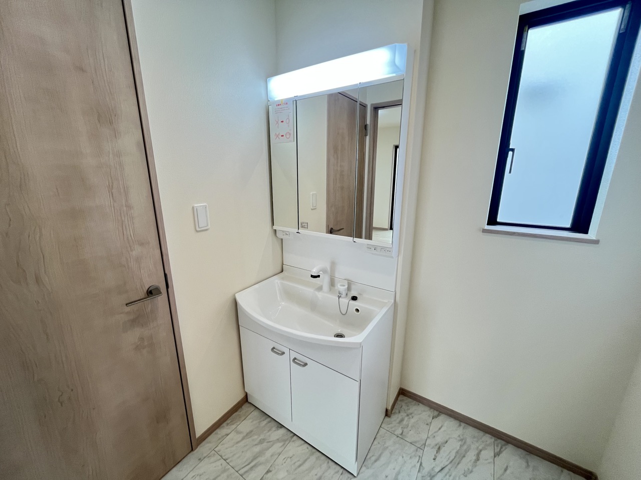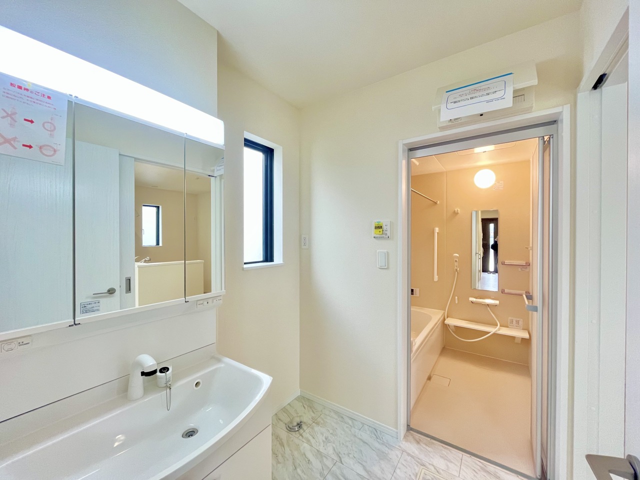 E号棟 使い勝手の良い洗面台、窓があることで換気もしやすく清潔感のある空間を保てます。 2026/02/27m