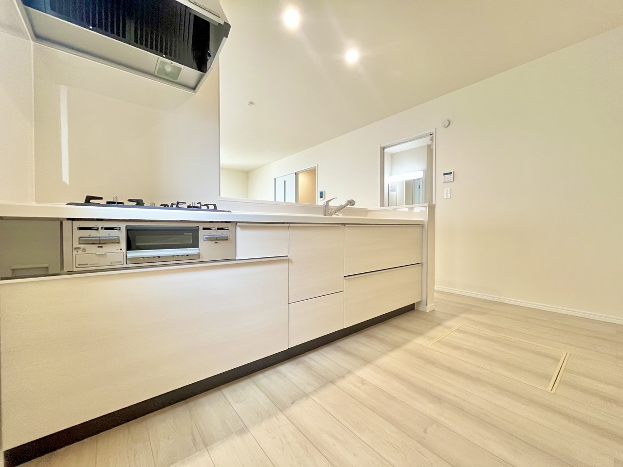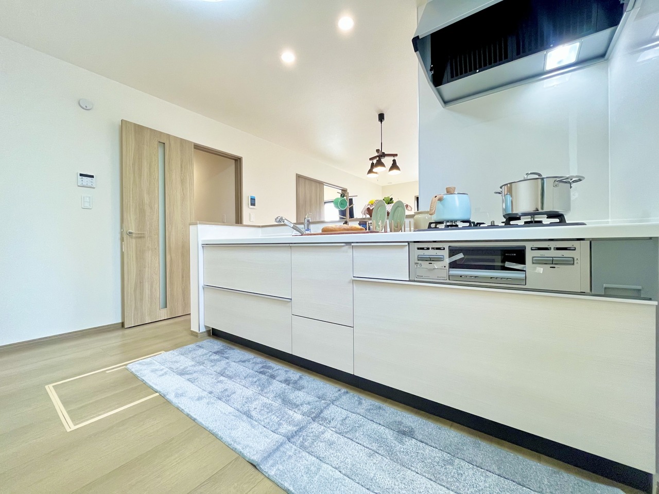 E号棟 リビングにいる家族の顔が見渡せるカウンターキッチン。お料理もより一層おいしく、楽しく。食器棚を背面に設置しても十分な広さを確保しています。 2026/02/27m