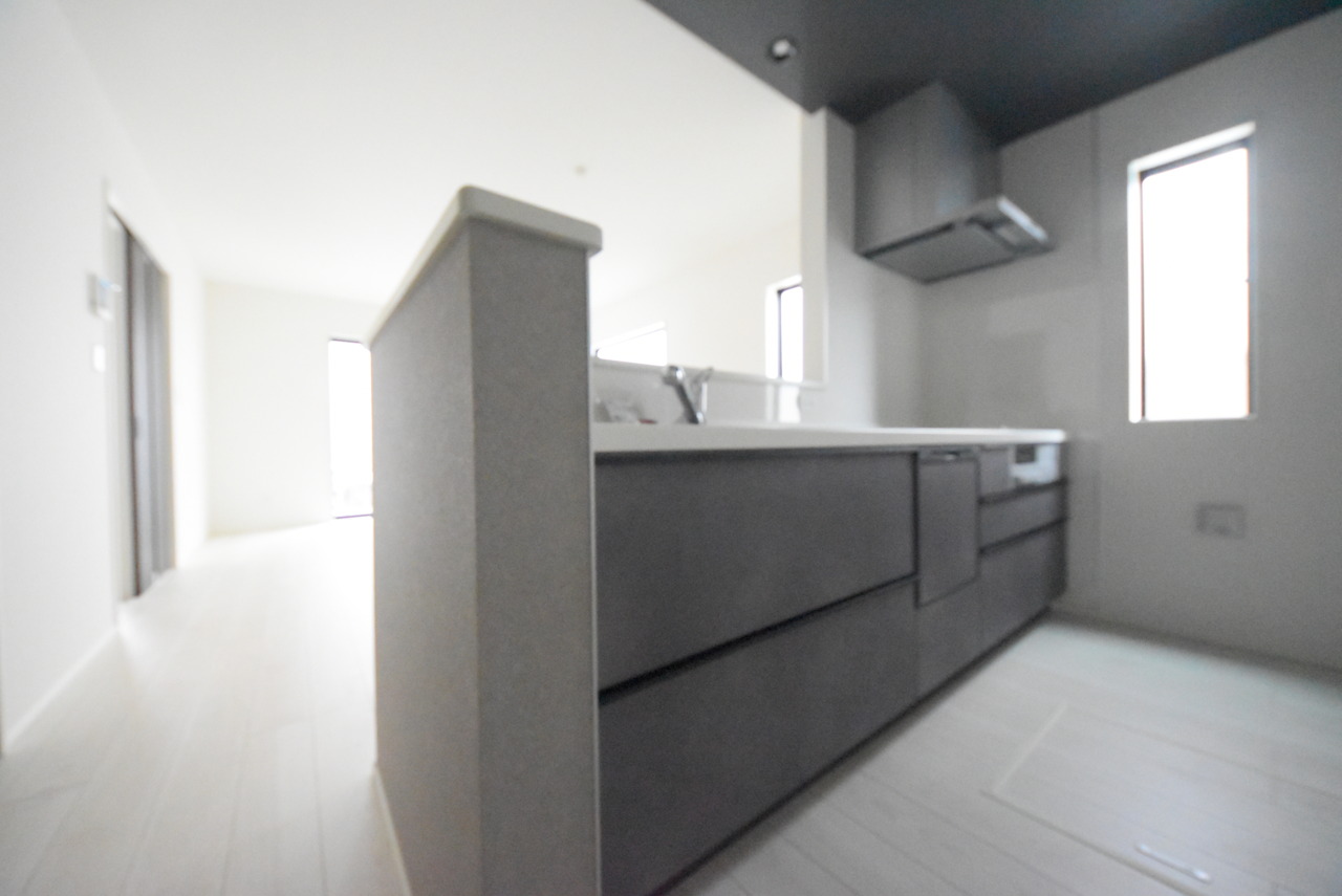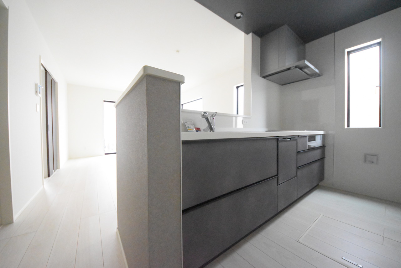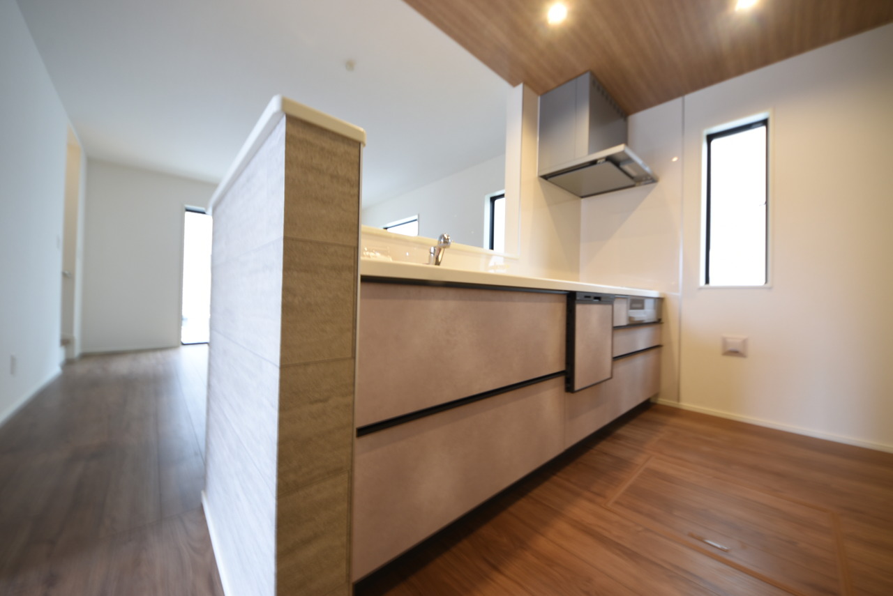 1号棟 リビングにいる家族の顔が見渡せるカウンターキッチン。お料理もより一層おいしく、楽しく。食器棚を背面に設置しても十分な広さを確保しています。 時短に活躍する食器洗浄機や一杯の水も楽しめる浄水器があるシステムキッチン。 2026/03/20m
