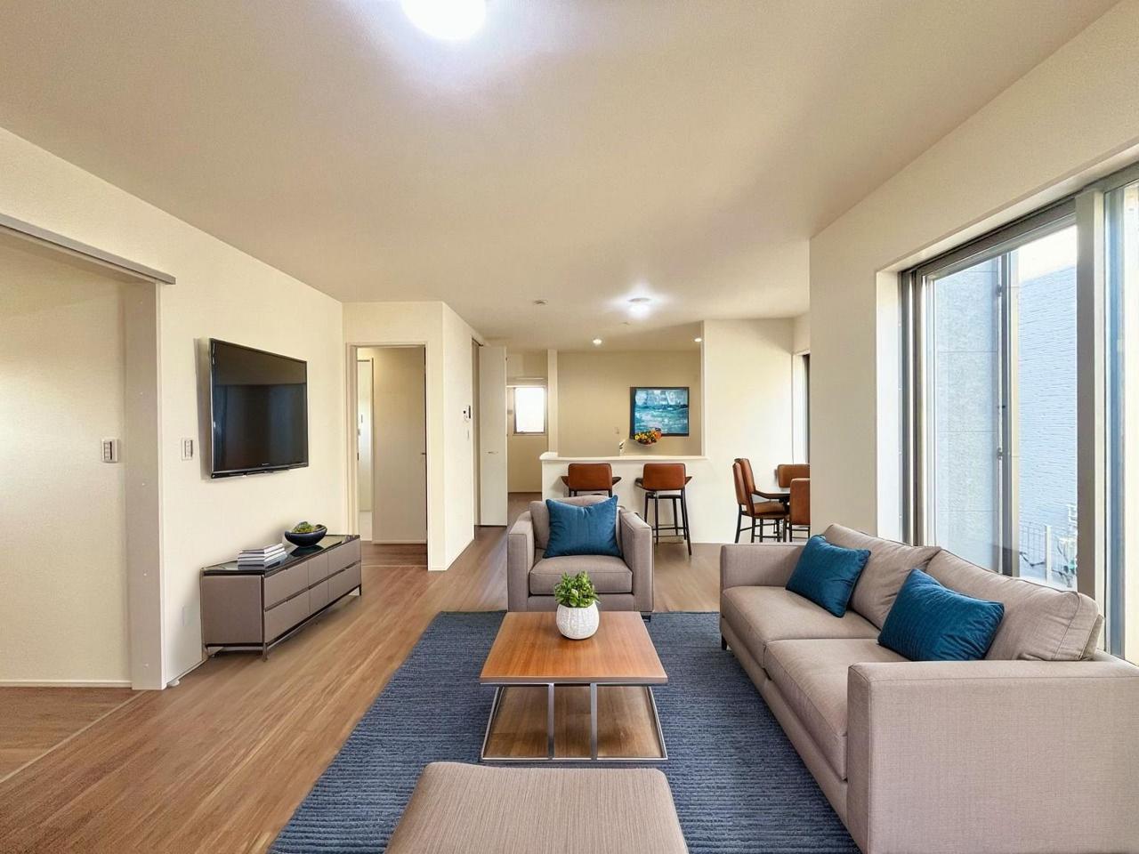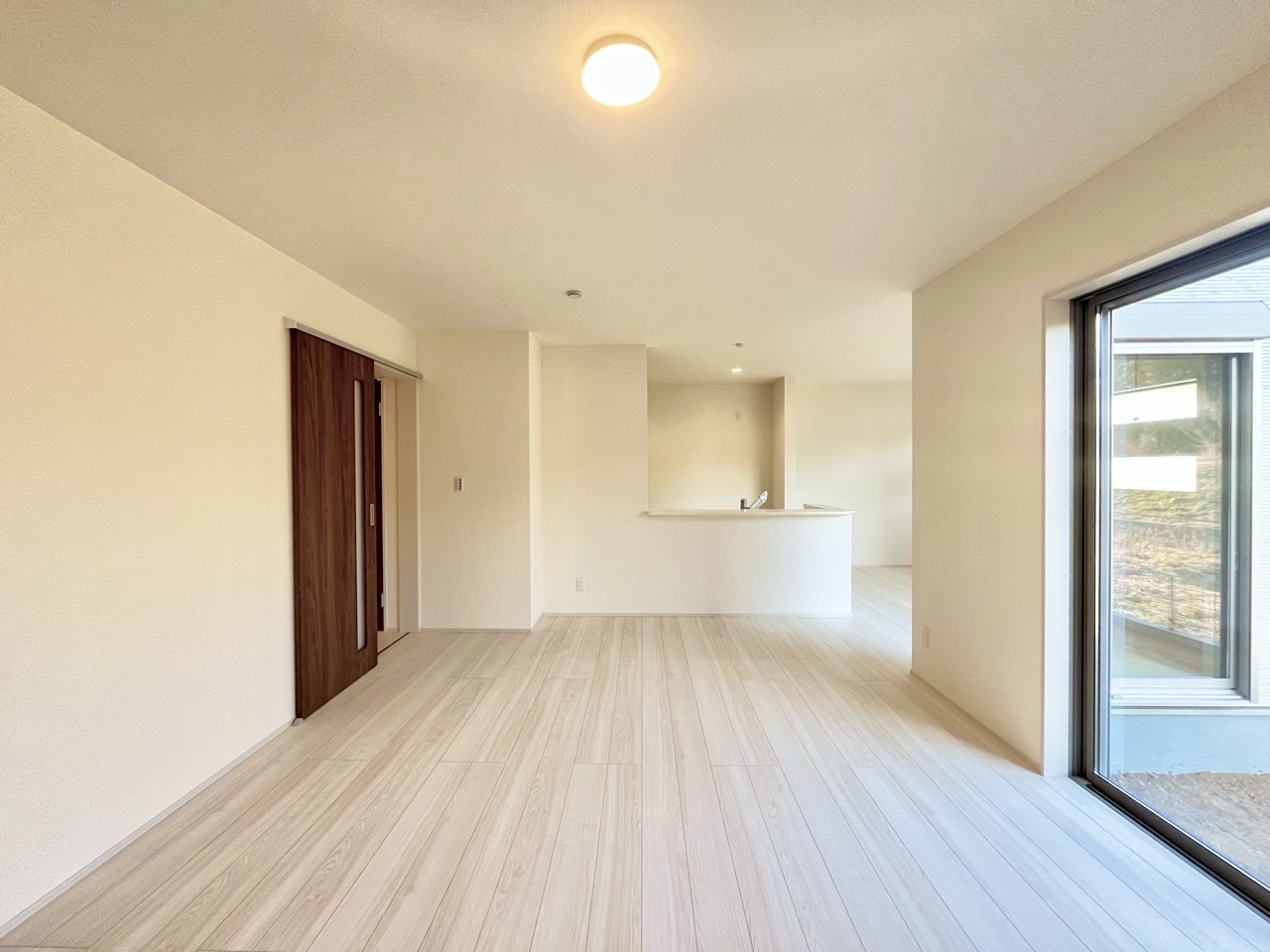 1号棟 家族や友人、両親、親戚とこれから沢山の時間を紡ぐのだろう。そこを彩るのは窓から見える青い空、心地よい緑。そんなイメージが膨らむリビングスペース。 2026/02/22m