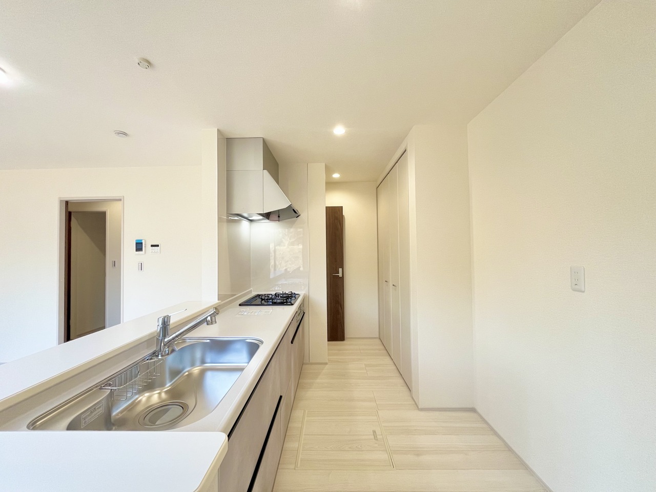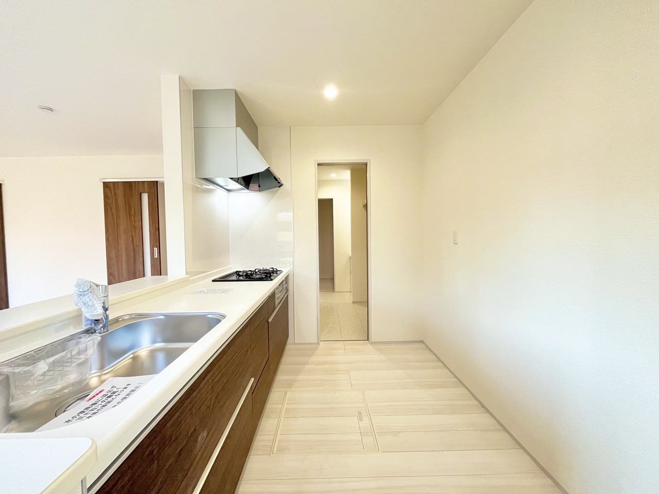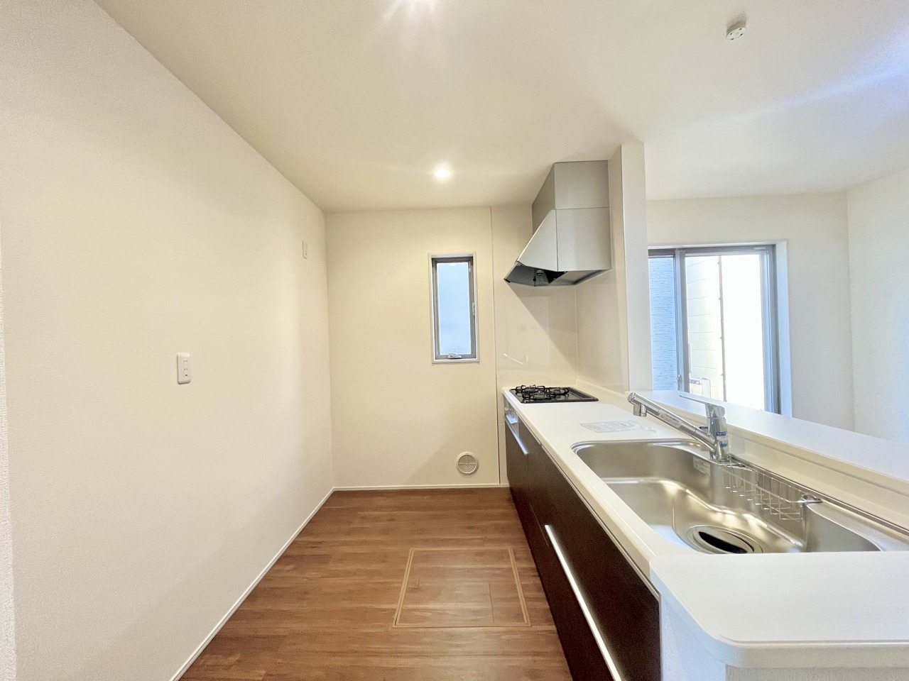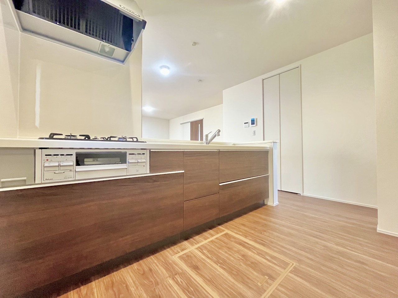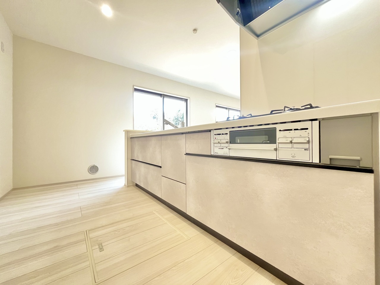 2号棟 リビングにいる家族の顔が見渡せるカウンターキッチン。お料理もより一層おいしく、楽しく。食器棚を背面に設置しても十分な広さを確保しています。 2026/02/22m