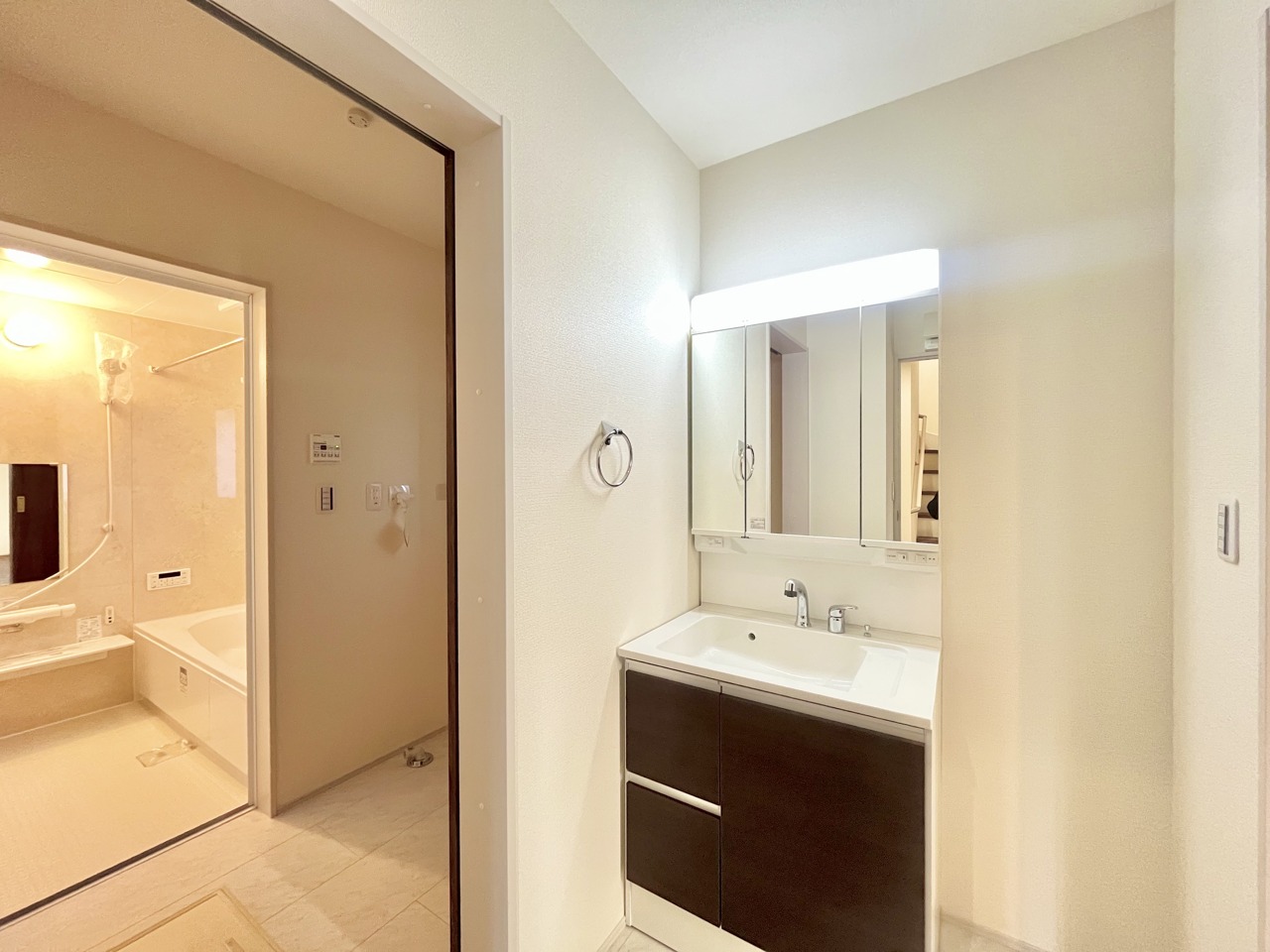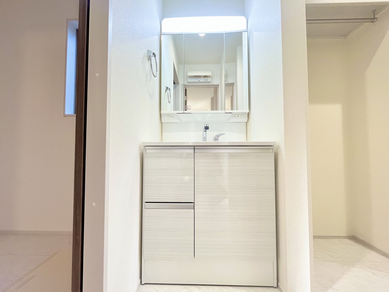 4号棟 お出かけ前の身だしなみに一歩差がつく三面鏡。ミラー裏にはたっぷり収納もございます。 2026/02/22m