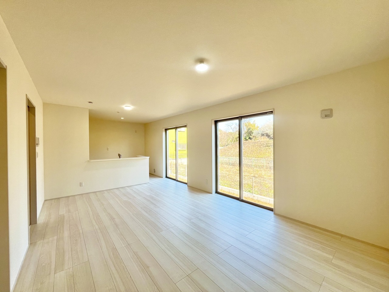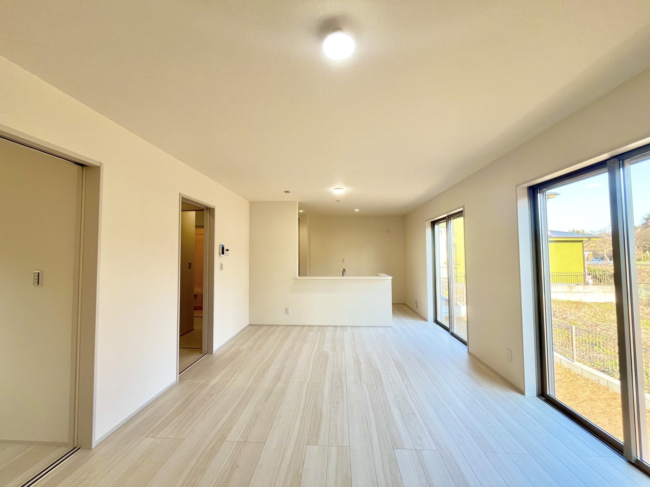 2号棟 家族や友人、両親、親戚とこれから沢山の時間を紡ぐのだろう。そこを彩るのは窓から見える青い空、心地よい緑。そんなイメージが膨らむリビングスペース。 2026/02/22m