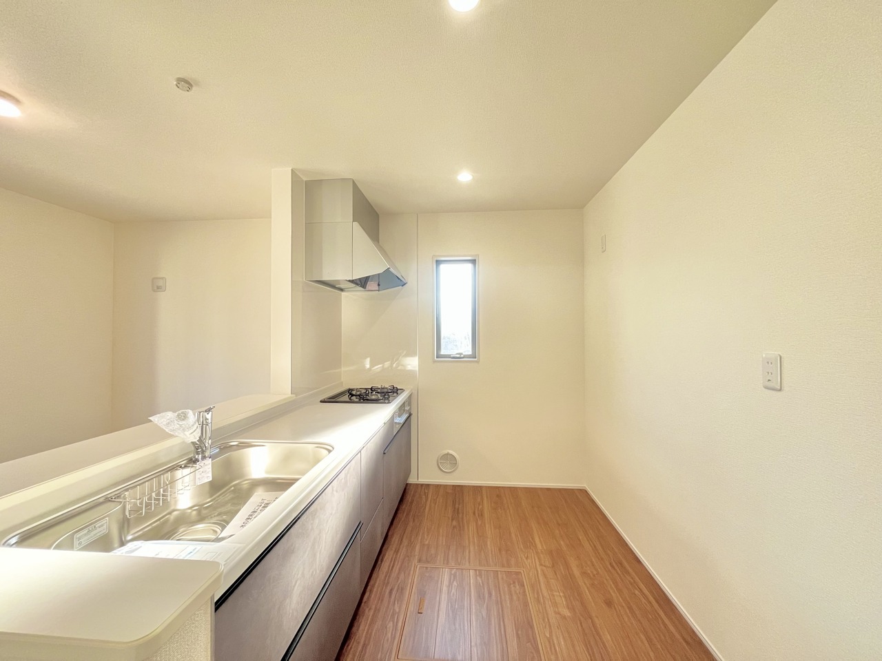 4号棟 リビングにいる家族の顔が見渡せるカウンターキッチン。お料理もより一層おいしく、楽しく。食器棚を背面に設置しても十分な広さを確保しています。 2026/02/22m