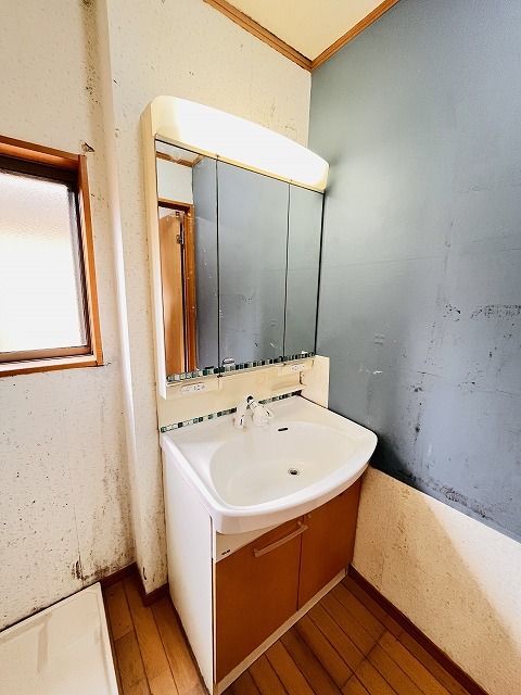三面鏡に洗面台。 コンセントに照明機能、多機能性を備えた設備です。