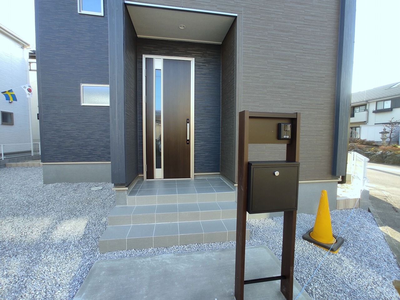 1号棟 ポスト、表札、インターホンを兼ねる機能門柱。シンプルな外観で容量のあるポストです。 2026/03/05m
