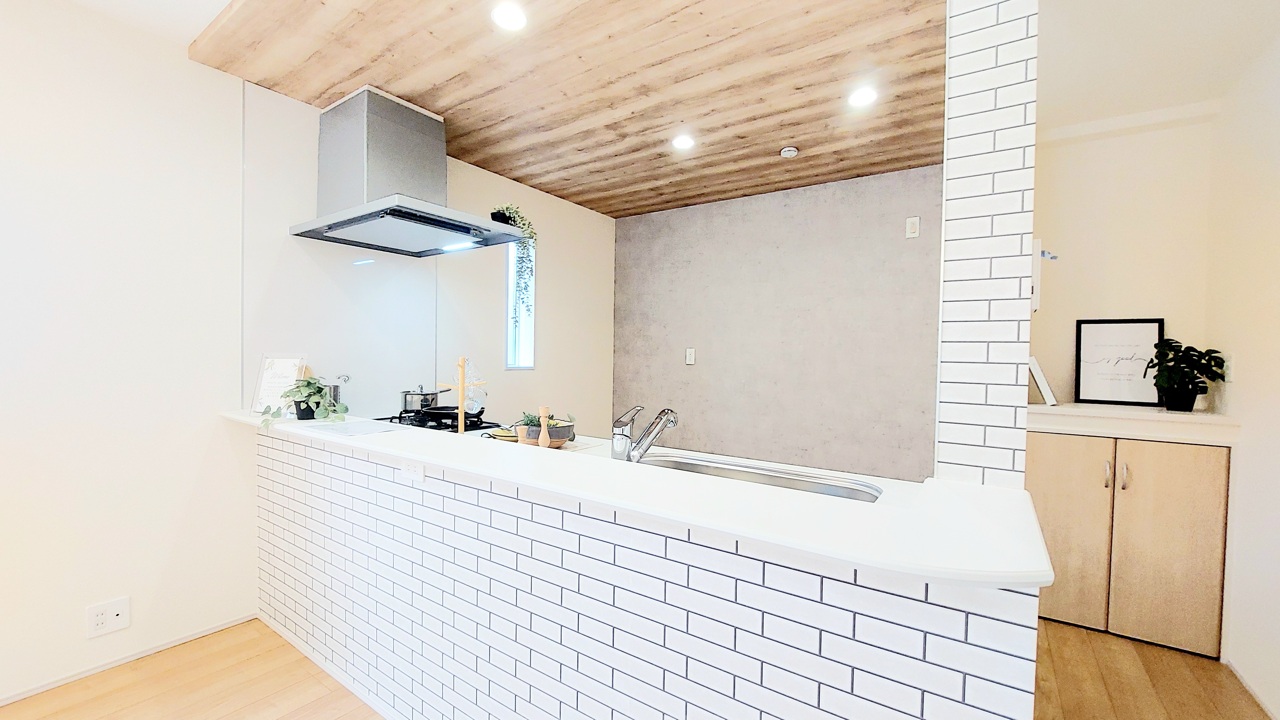 8号棟 リビングにいる家族の顔が見渡せるカウンターキッチン。お料理もより一層おいしく、楽しく。食器棚を背面に設置しても十分な広さを確保しています。 2026/03/26m