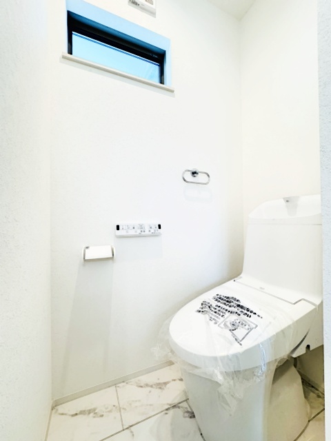 ウォシュレット機能付きのトイレ。換気のしやすい窓付きで、収納もあり実用性も兼ね備えた造り。