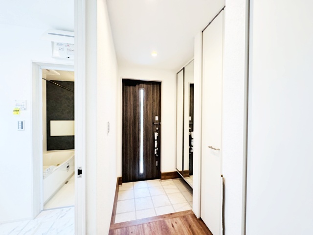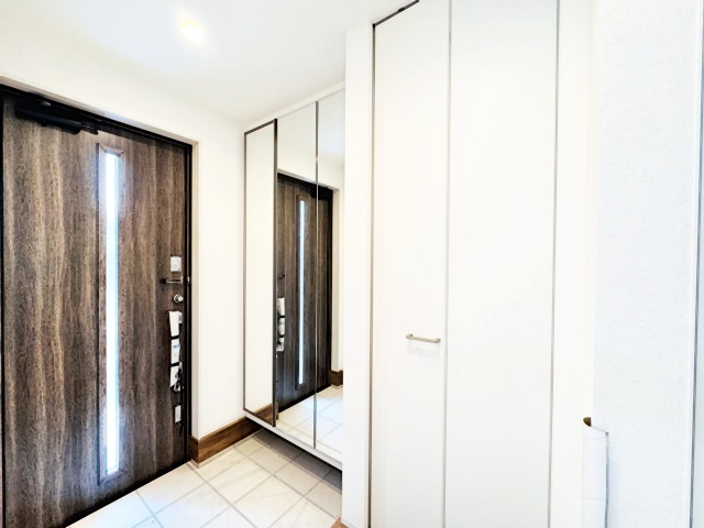 お宅の顔となる明るく開放的な玄関。ご家族皆様様の靴を収納できるスペースと全身鏡があり、お出掛け前に身だしなみチェックもできます。