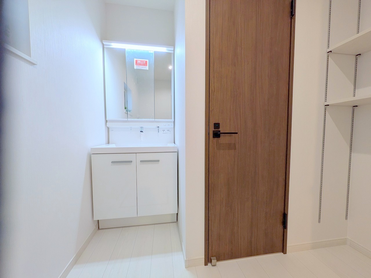 化粧台はやっぱり色が一番。シャワーヘッド付きの収納充実タイプです。