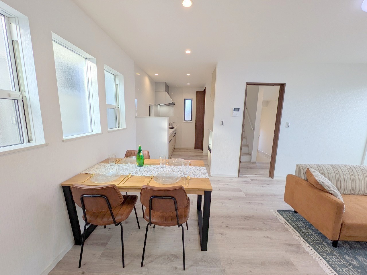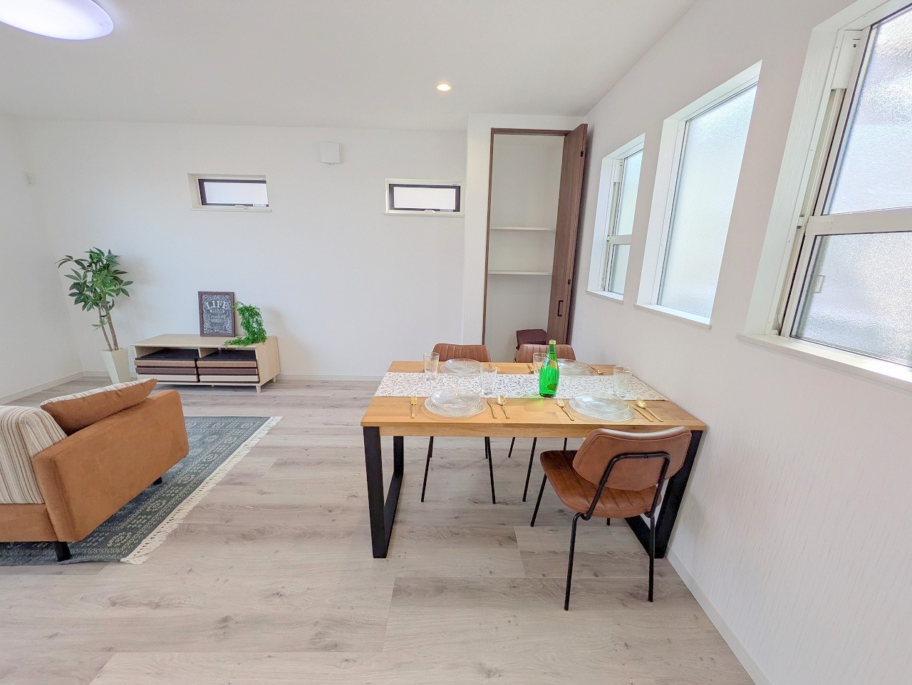 ダイニングテーブルと椅子の周りに採光窓がある、明るいダイニングスペースです。