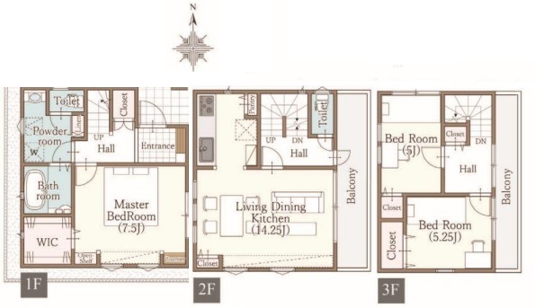 | 間取 | 3LDK + 1F洋7.5×1・2FLDK14.2×1・3F洋5.2×1・3F洋5×1 | ||