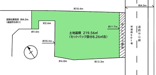 | 土地面積 | 217.15m² 公簿 (私道280m²別に有、私道持分比率:1/4、セットバック8.26m²) | ||