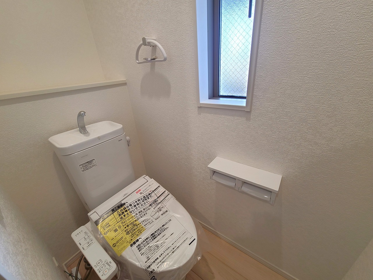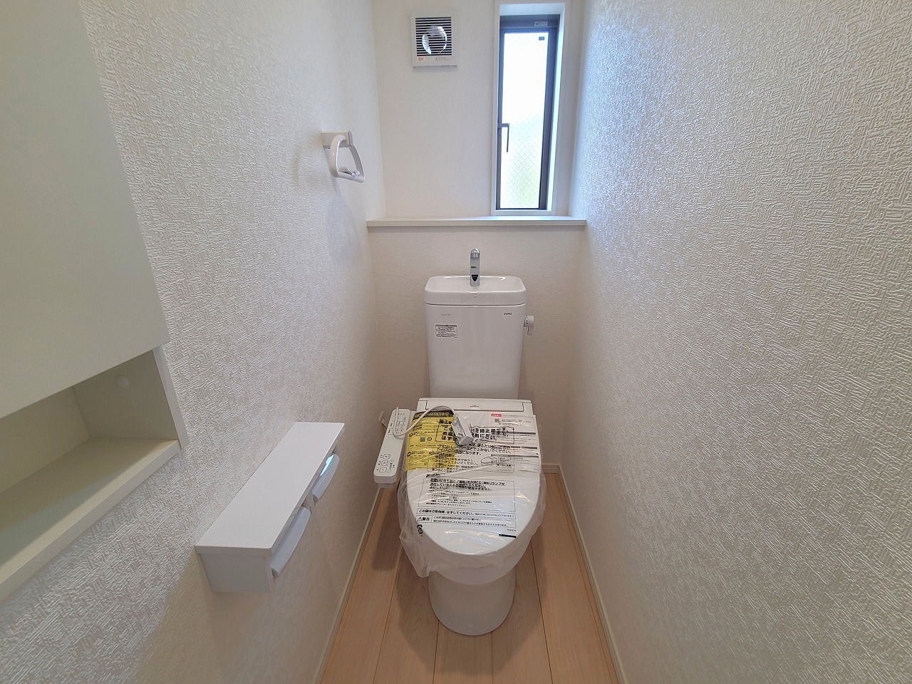 1号棟 ウォシュレット機能付きのトイレ。換気のしやすい窓付きで、収納もあり実用性も兼ね備えた造り。