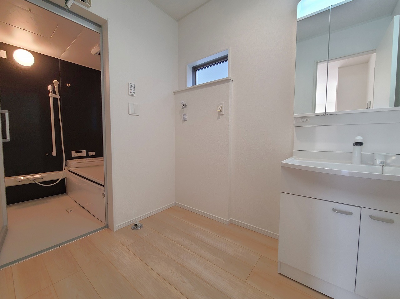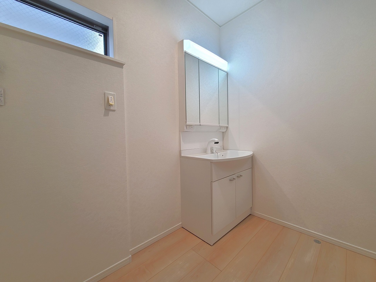 1号棟 使い勝手の良い洗面台、窓があることで換気もしやすく清潔感のある空間を保てます。