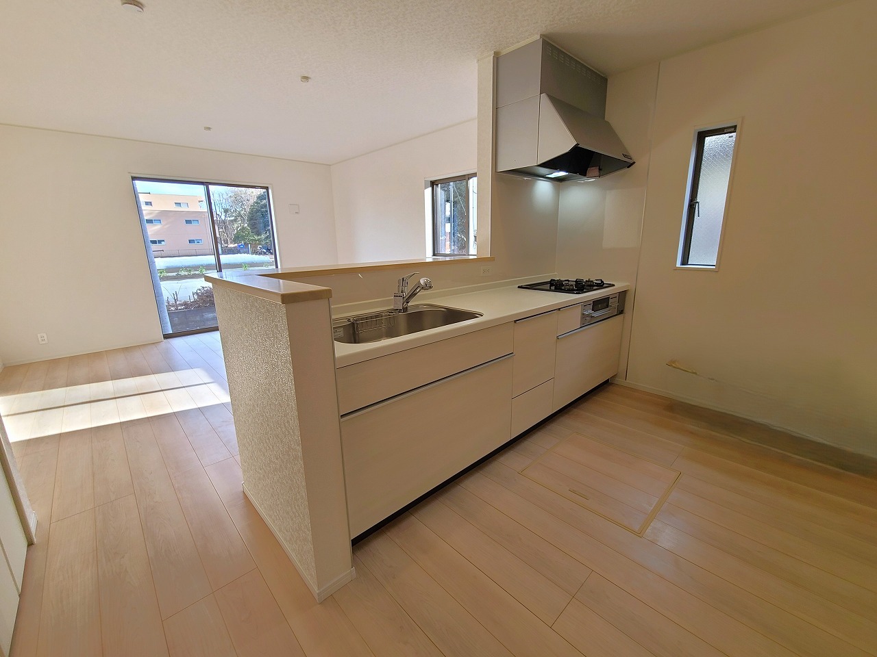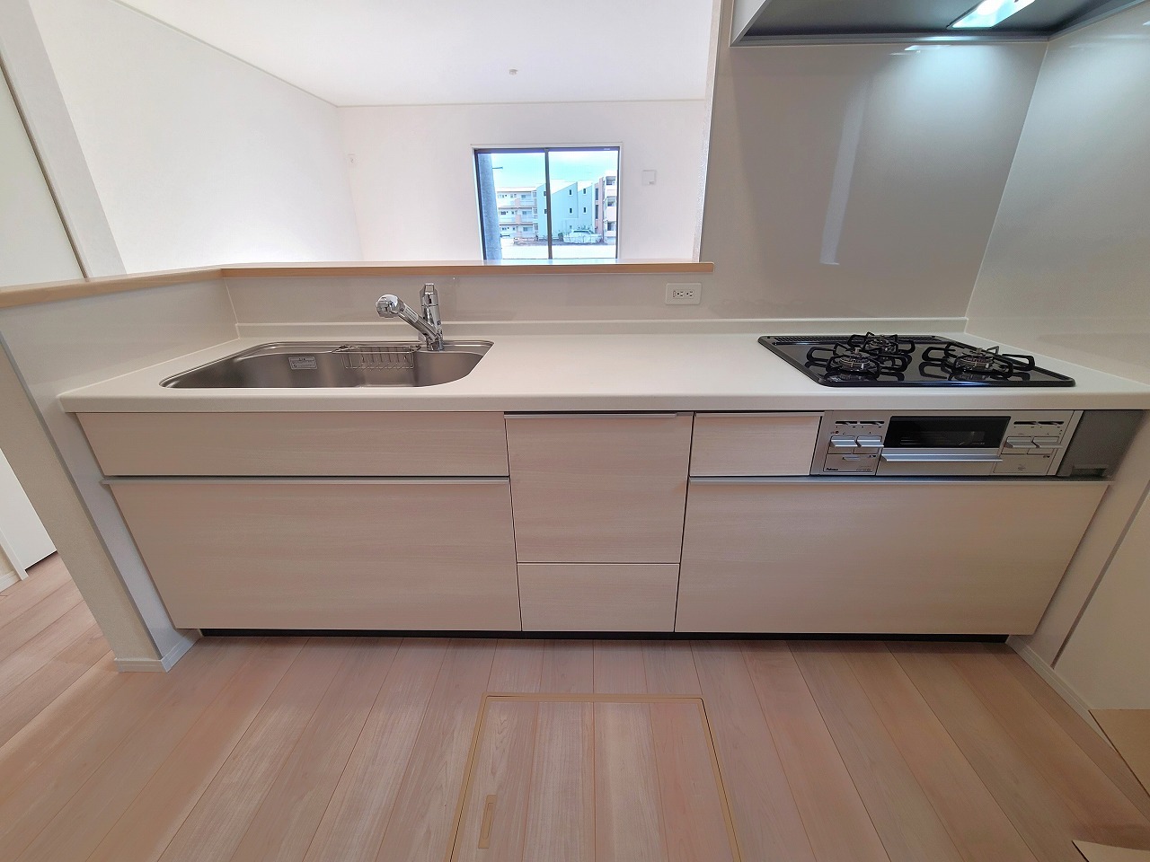 1号棟 リビングにいる家族の顔が見渡せるカウンターキッチン。お料理もより一層おいしく、楽しく。食器棚を背面に設置しても十分な広さを確保しています。