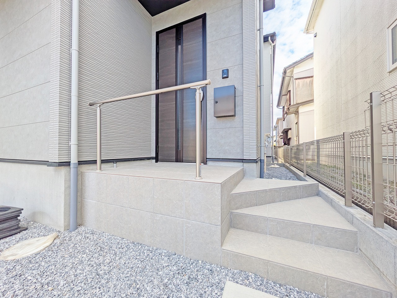 ポーチのついた新築分譲物件。玄関の印象はいかがでしょうか?入口からご覧ください。
