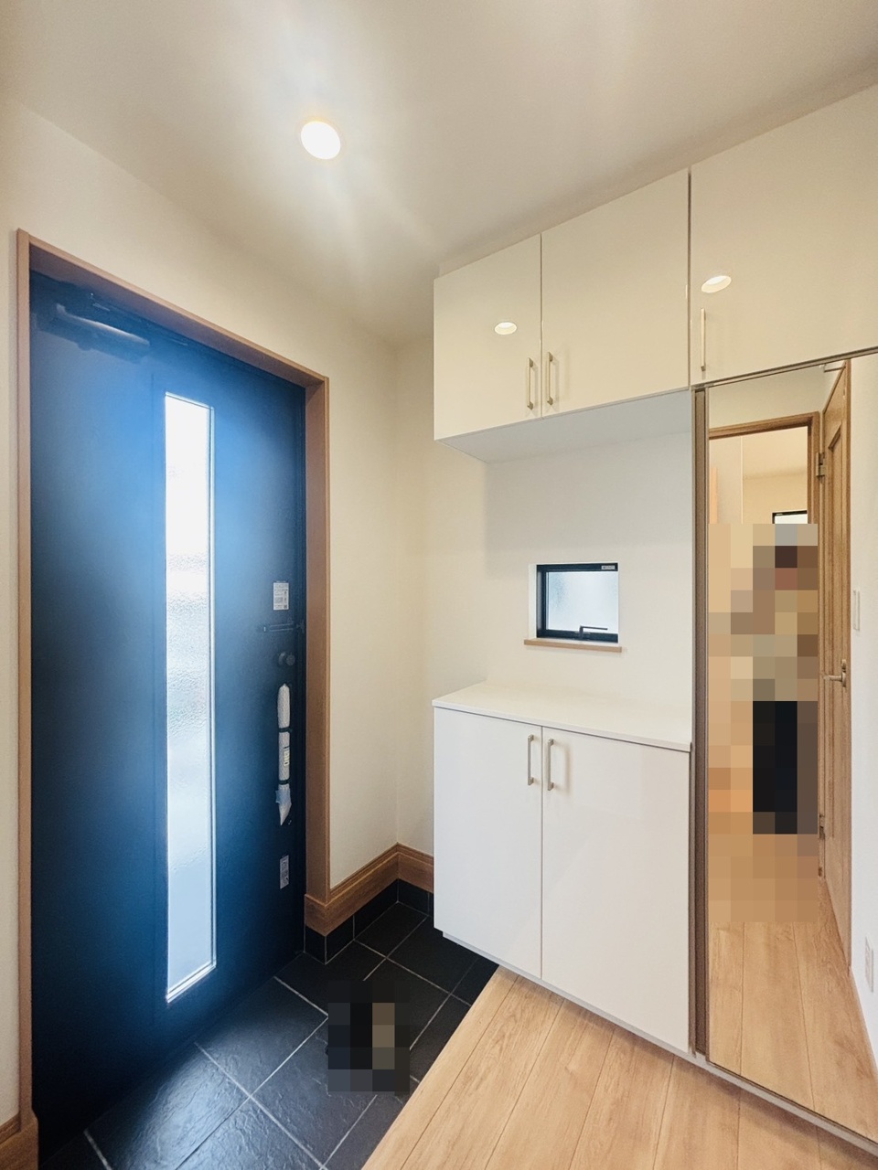 お宅の顔となる明るく開放的な玄関。ご家族皆様様の靴を収納できるスペースと全身鏡があり、お出掛け前に身だしなみチェックもできます。