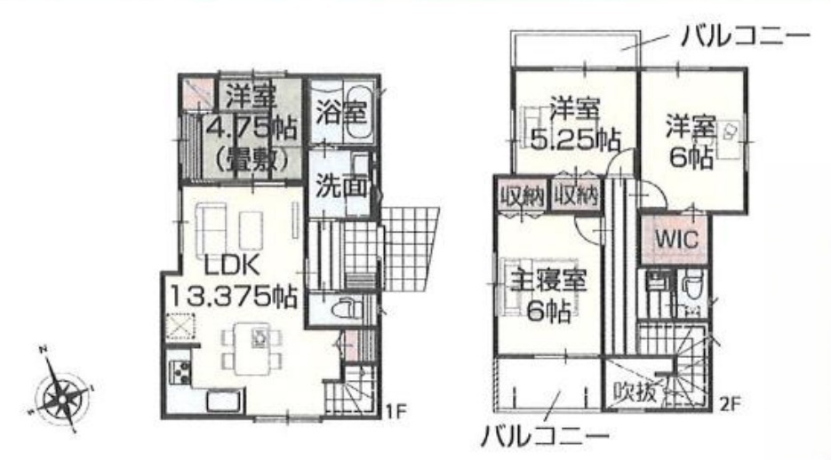 | 間取 | 4LDK+WIC (LDK13.375帖、和室4.75帖、洋室6帖、洋室6帖、洋室5.25帖) | ||
