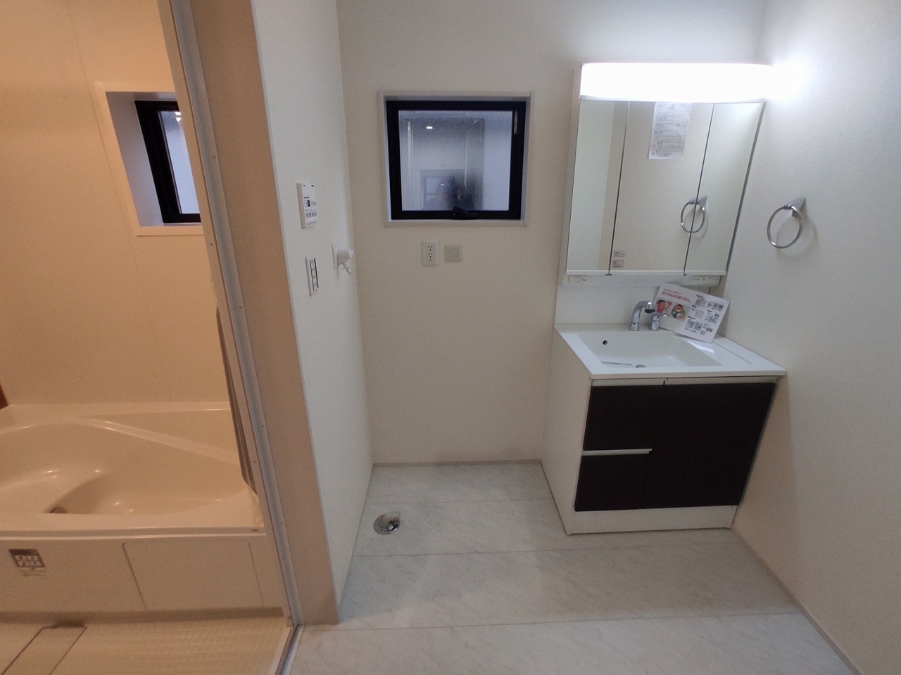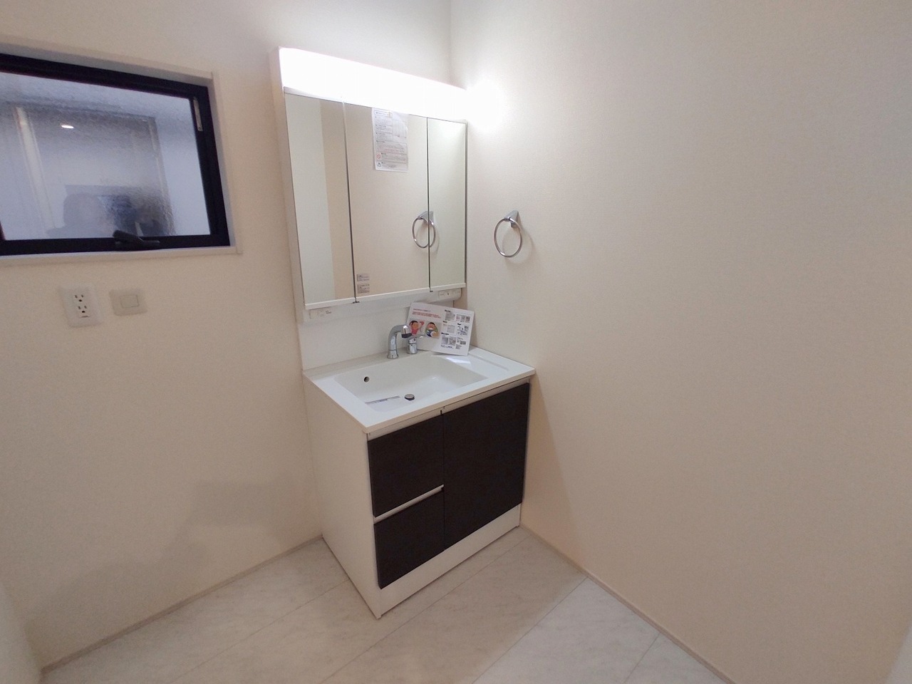 三面鏡を採用した洗面化粧台。鏡の裏にも収納スペースがあります。