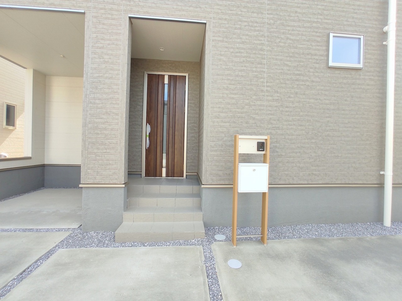 玄関ドアをあけてすぐの場所に配置された機能門柱。ポスト、表札、照明が一点に集中しています。