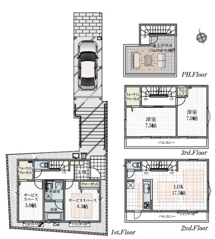 | 間取 | 2SLDK (LDK17.5帖、洋室7.5帖、洋室7.0帖、S6.3帖、S5.0帖) | ||