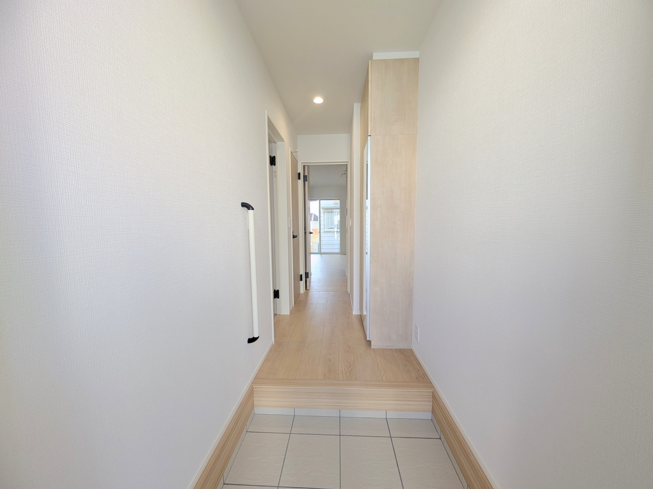 誰も住んだことのない家の玄関スペース。あたらしい木のにおいを感じていただけると思います。