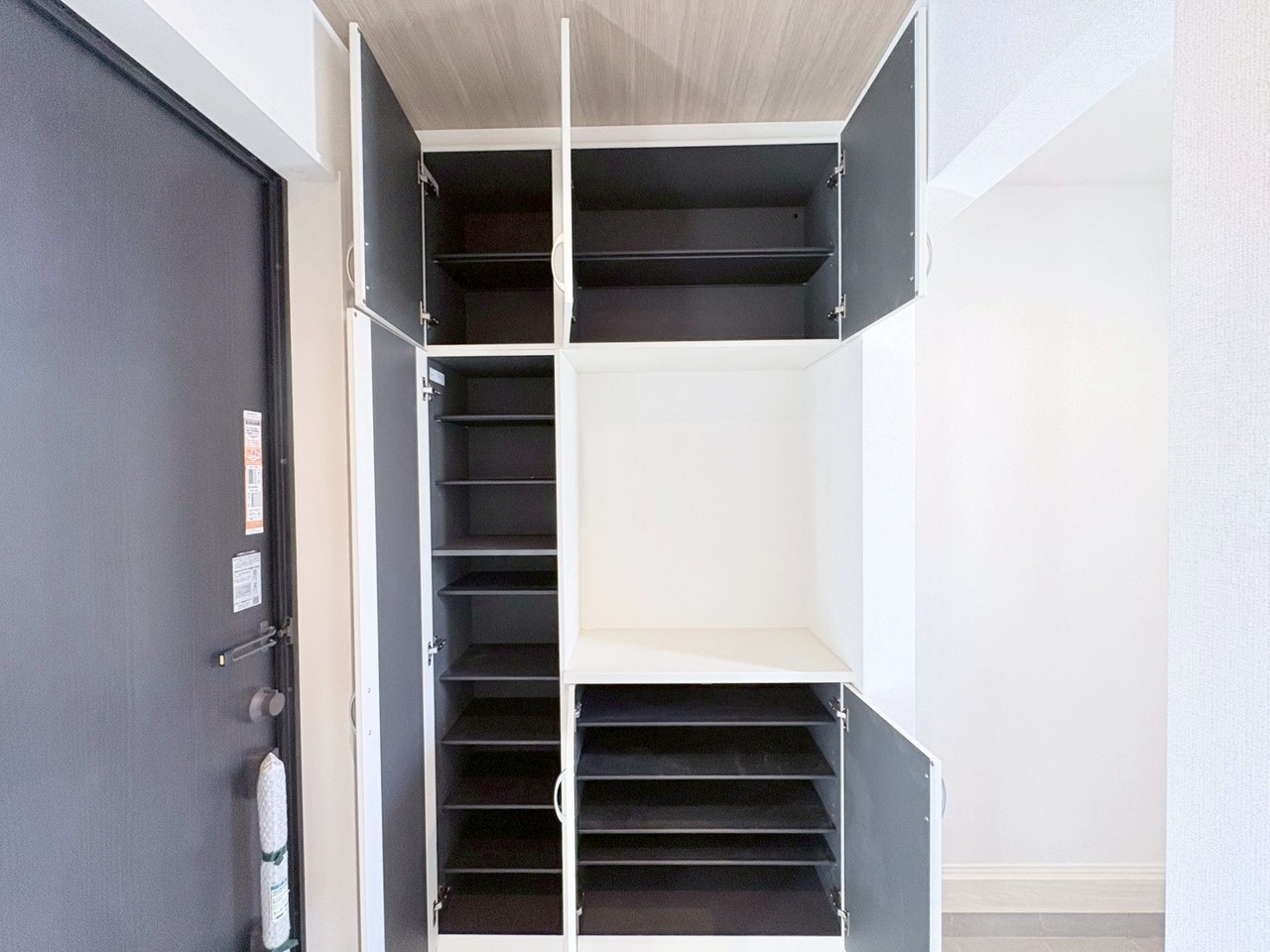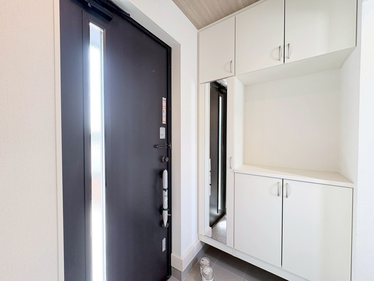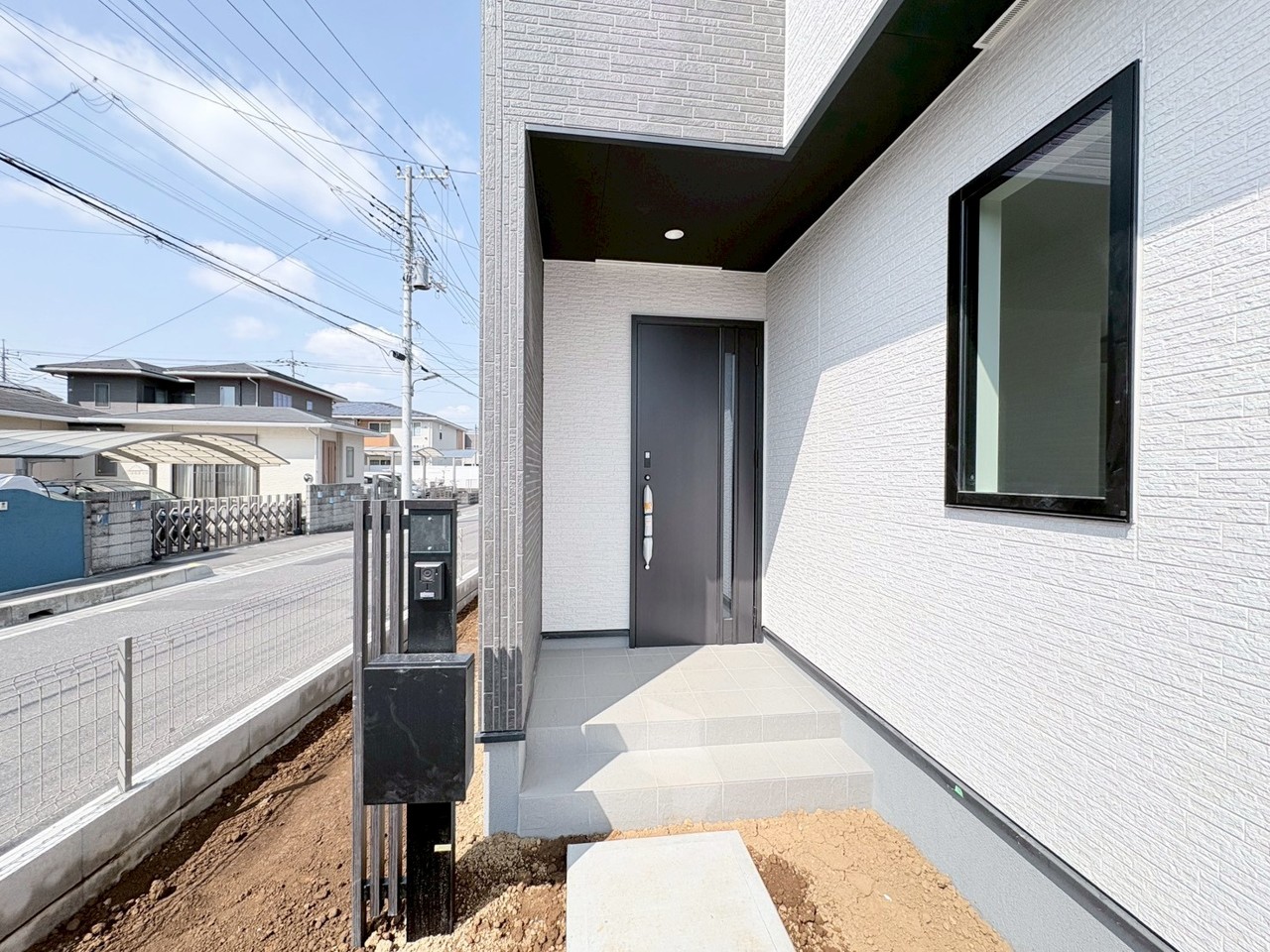 白壁に映えるモダンな玄関が、日常を洗練された空間へと誘います。