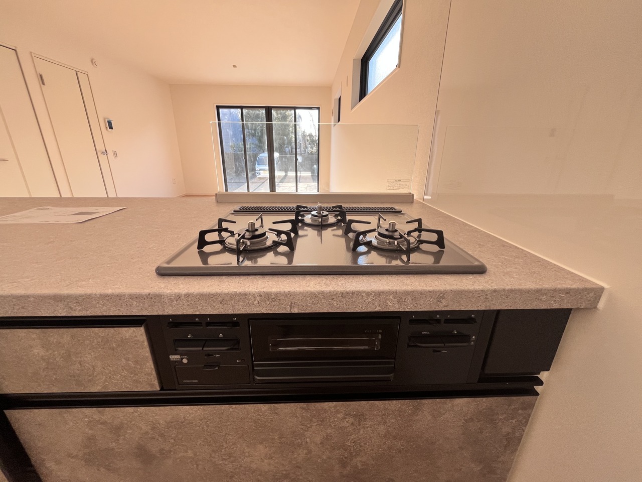 リビングにいる家族の顔が見渡せるカウンターキッチン。お料理もより一層おいしく、楽しく。食器棚を背面に設置しても十分な広さを確保しています。