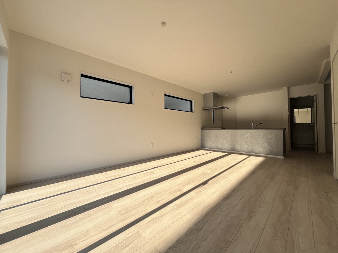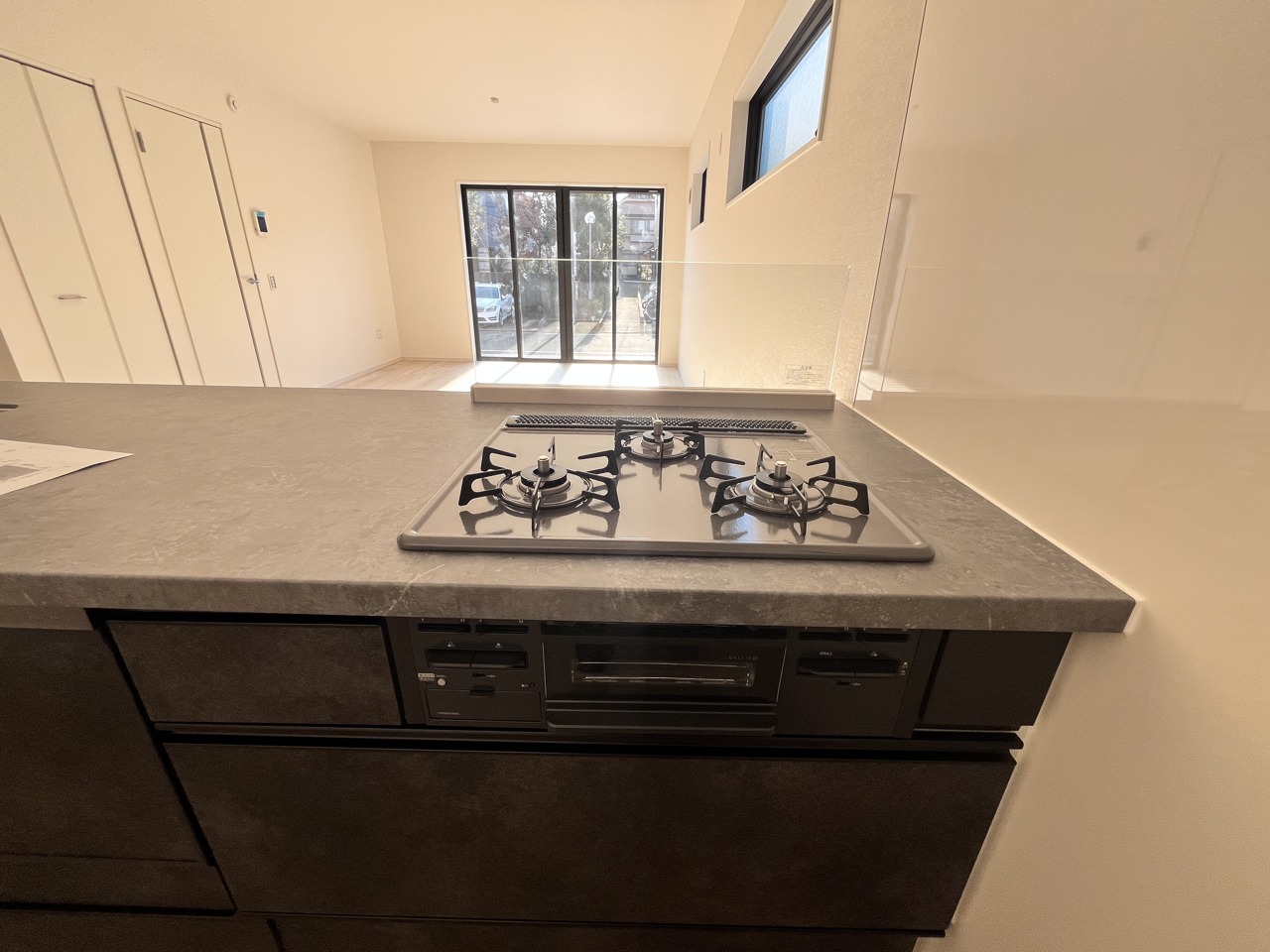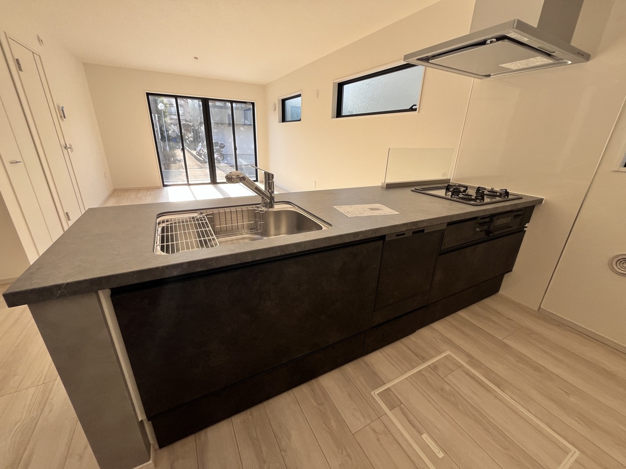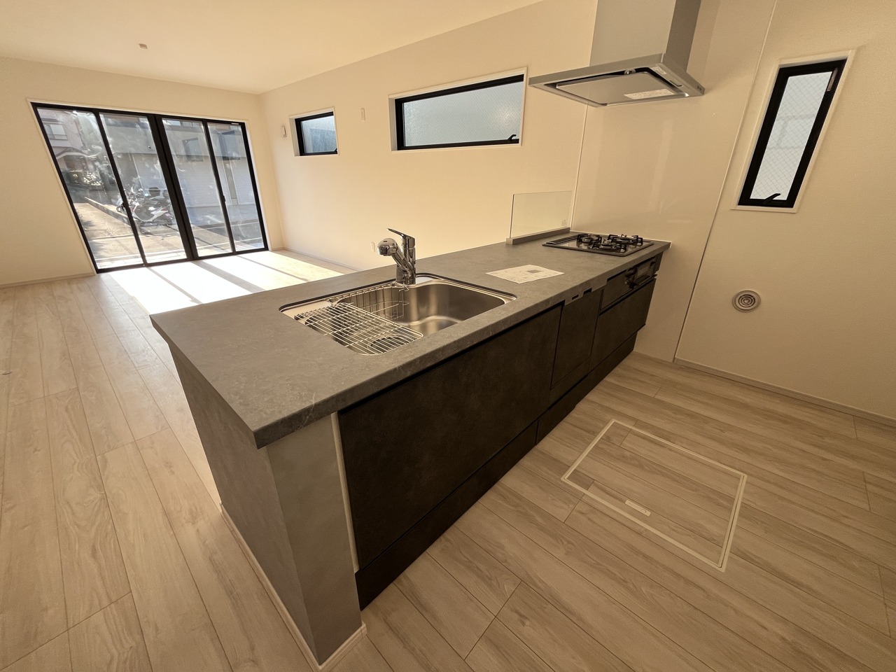 2号棟 ペニンシュラスタイルのキッチン 広がりを感じさせる開口部から、清々しい風が吹き抜ける