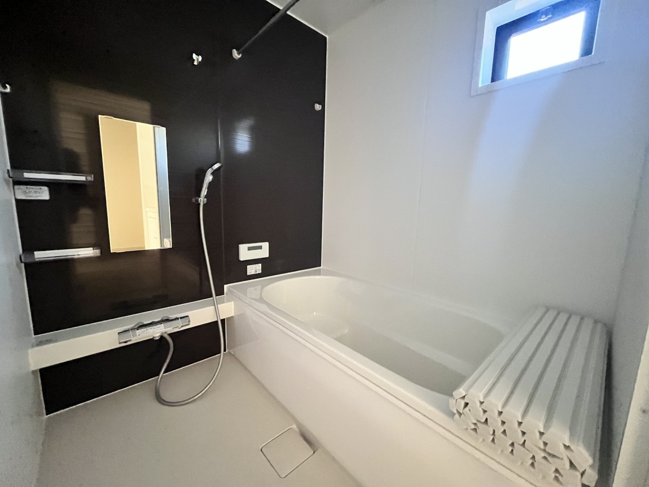 2号棟 落ち着いた色味の浴室で1日の疲れをゆっくりと癒してください。