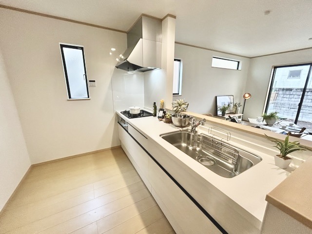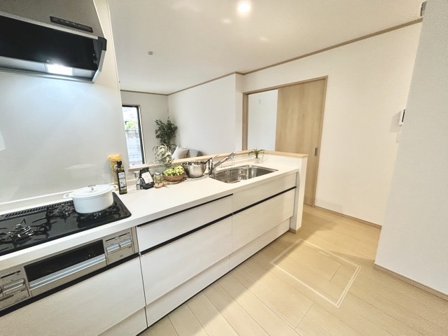 リビングにいる家族の顔が見渡せるカウンターキッチン。お料理もより一層おいしく、楽しく。食器棚を背面に設置しても十分な広さを確保しています。