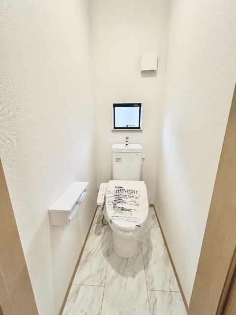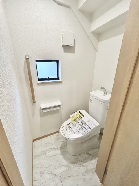 ウォシュレット機能付きのトイレ。換気のしやすい窓付きで、収納もあり実用性も兼ね備えた造り。