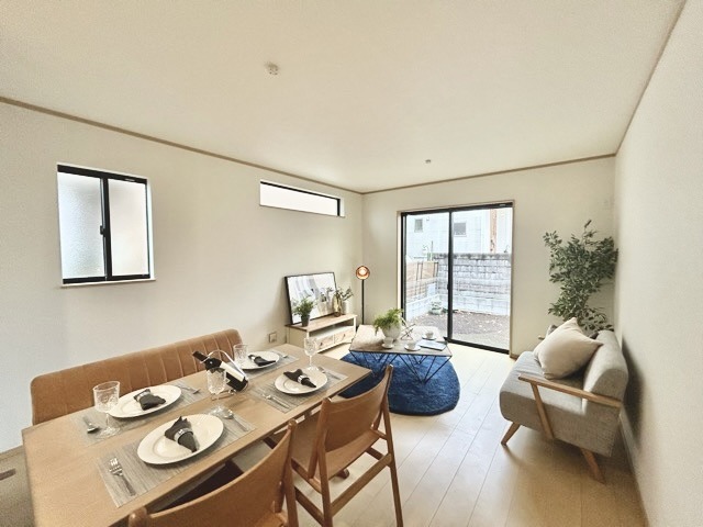 家族団欒のリビング。陽光差し込む食卓には家族の会話とスマイルが溢れます。いつまでもここで食卓を囲みたくなる、そう感じさせてくれるスペース。
