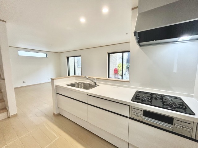 リビングにいる家族の顔が見渡せるカウンターキッチン。お料理もより一層おいしく、楽しく。食器棚を背面に設置しても十分な広さを確保しています。