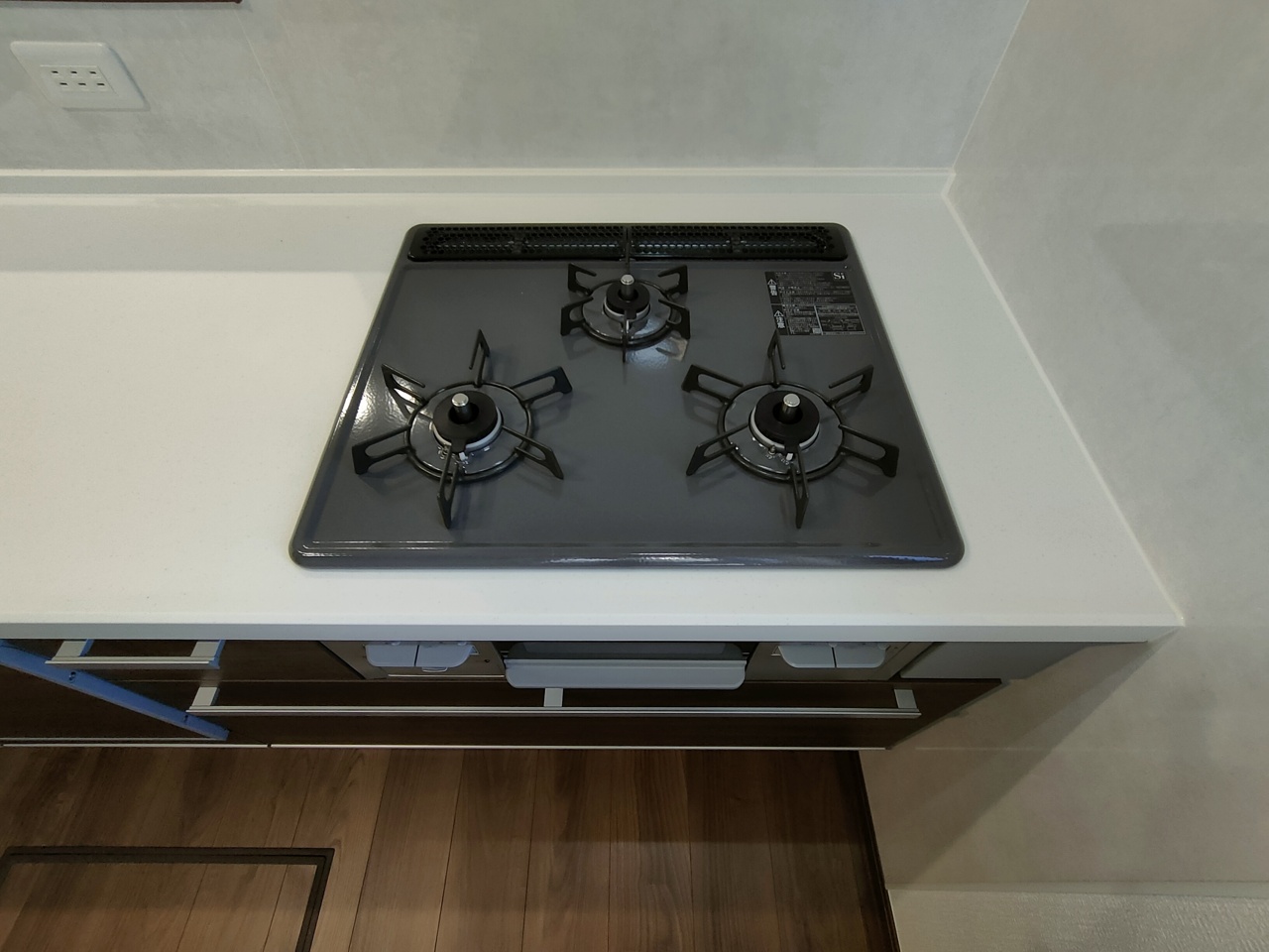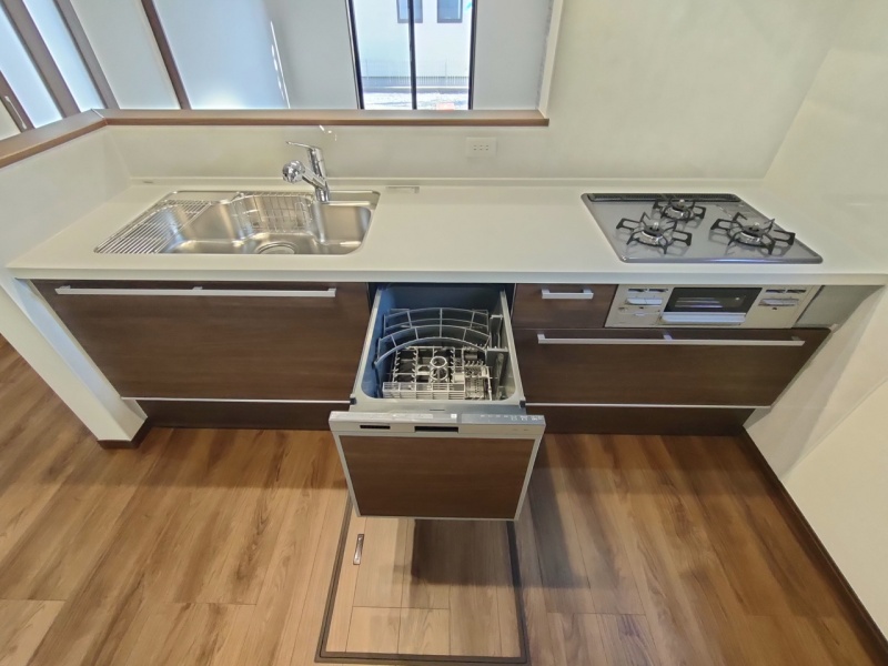スライド収納付きシステムキッチン。お鍋類の出し入れもスムーズ。