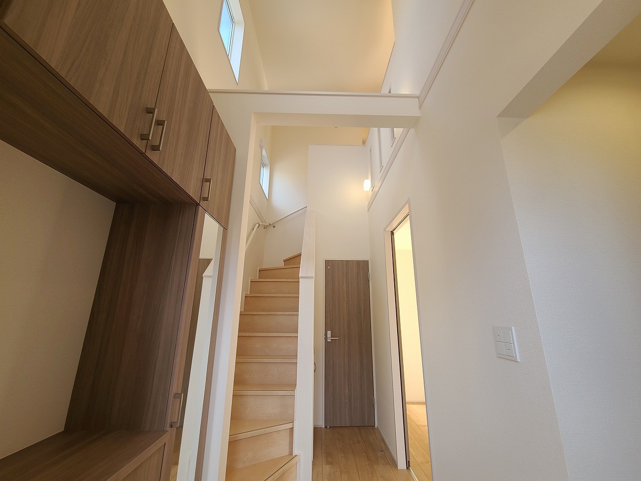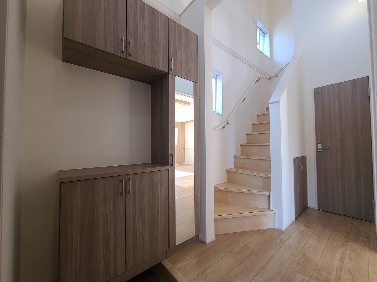 明るく開放的な玄関、靴の脱ぎ履きもしやすく、収納も豊富でご家族皆様の靴をスッキリ収納できます。