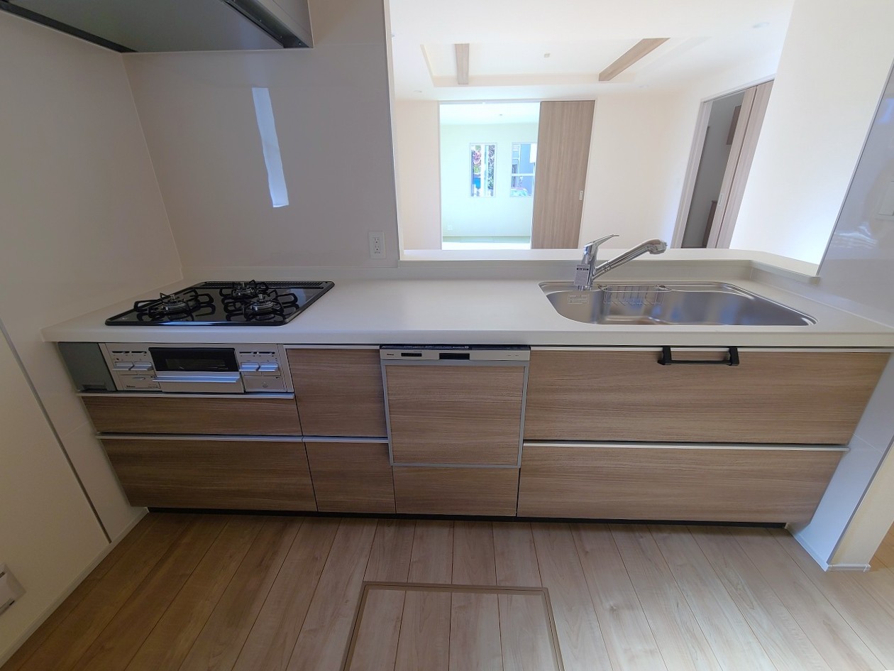 リビングにいる家族の顔が見渡せるカウンターキッチン。お料理もより一層おいしく、楽しく。食器棚を背面に設置しても十分な広さを確保しています。