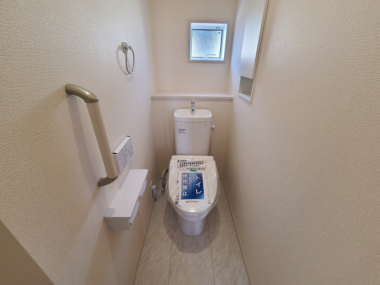 ウォシュレット機能付きのトイレ。換気のしやすい窓付きで、収納もあり実用性も兼ね備えた造り。