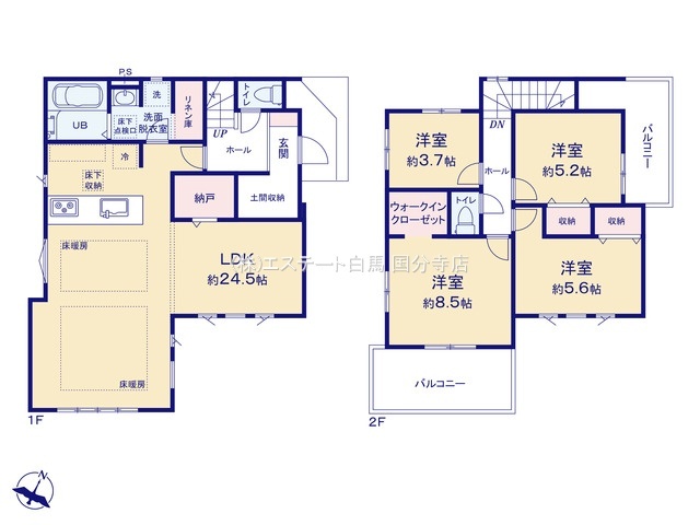 LDK24.5帖、食洗機、床暖房付。土間収納、納戸、リネン庫、WICあり。南東・北東2面バルコニー。駐車3台可(車種による)。コンビニまで徒歩4分。