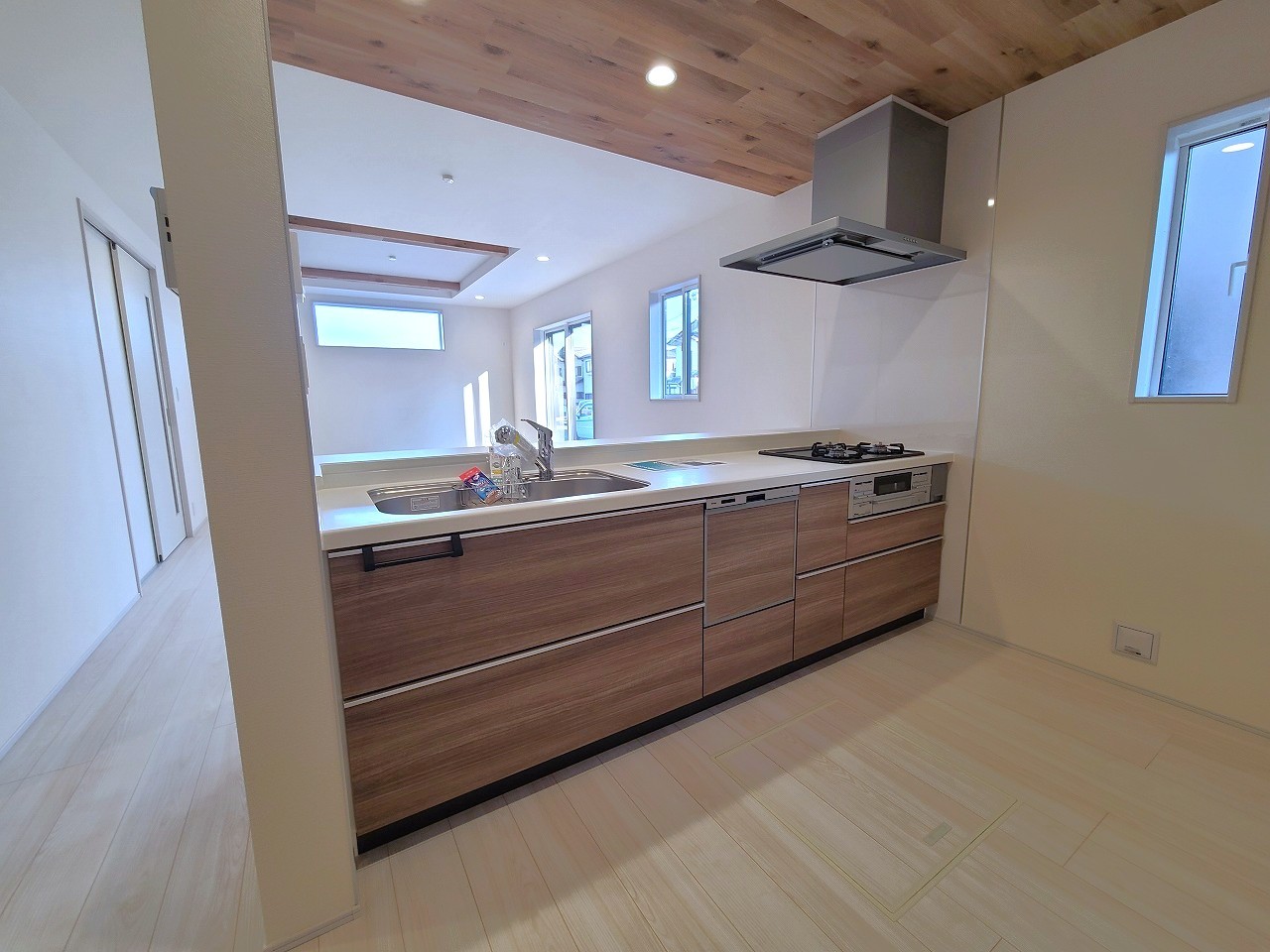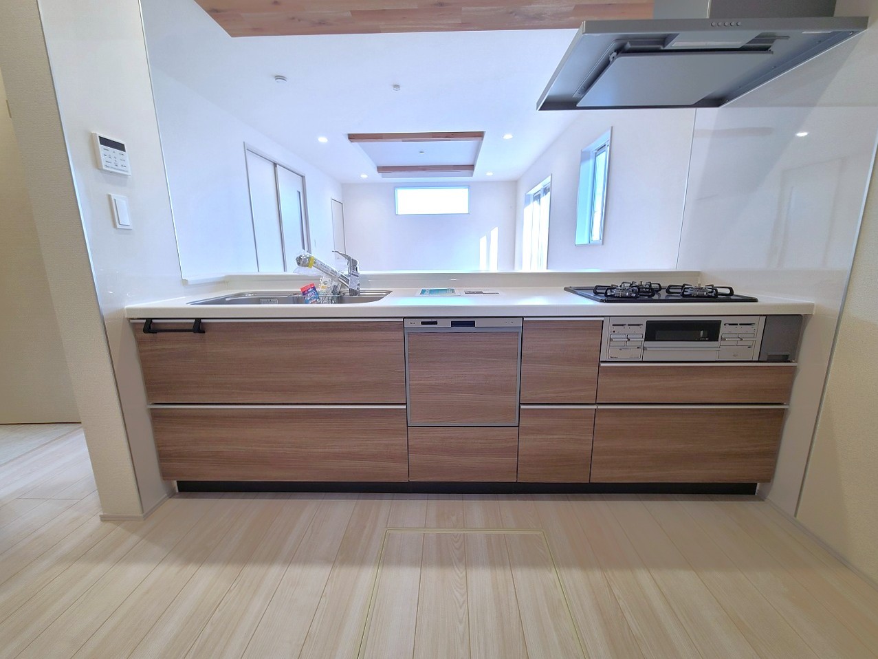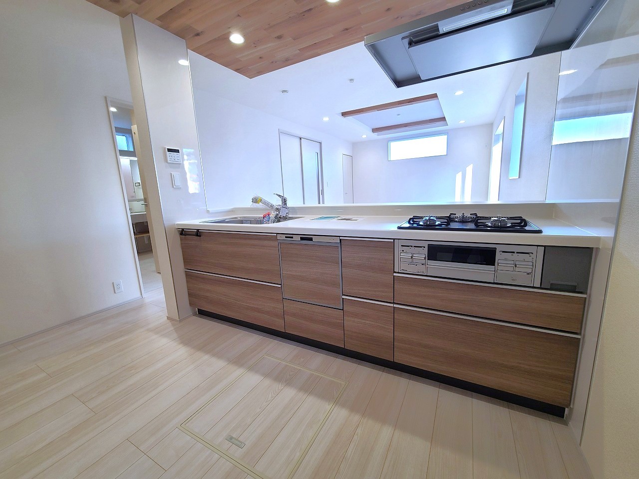 2号棟 リビングにいる家族の顔が見渡せるカウンターキッチン。お料理もより一層おいしく、楽しく。食器棚を背面に設置しても十分な広さを確保しています。